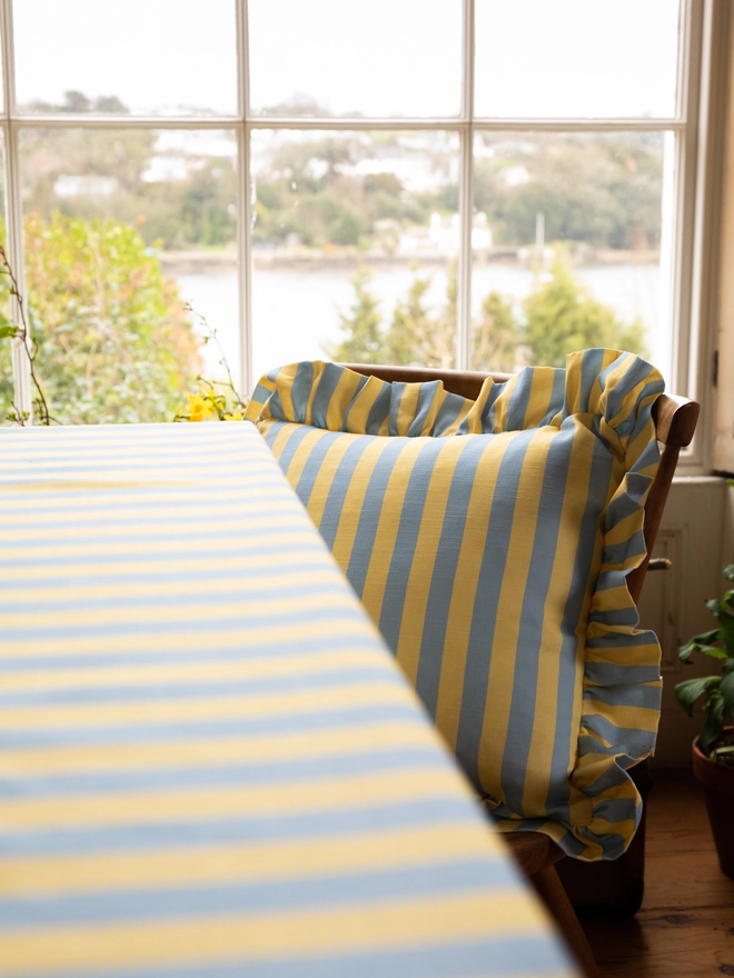 This gorgeous tablecloth is handmade from our new linen‘Trianon’. With stripes in zesty yellow and sky blue, this vibrant and practical fabric is ideal for spring dining.