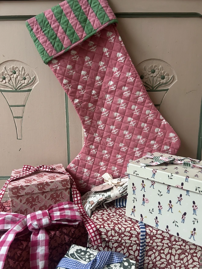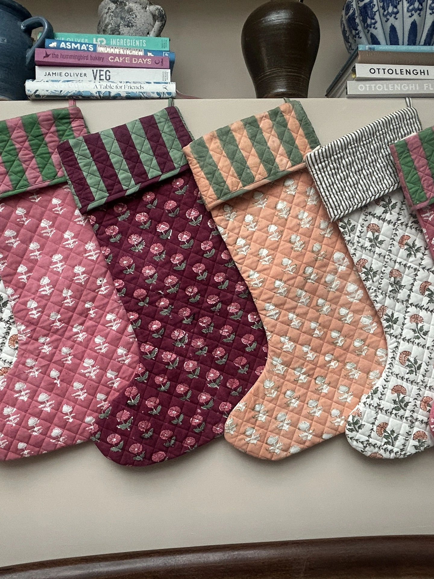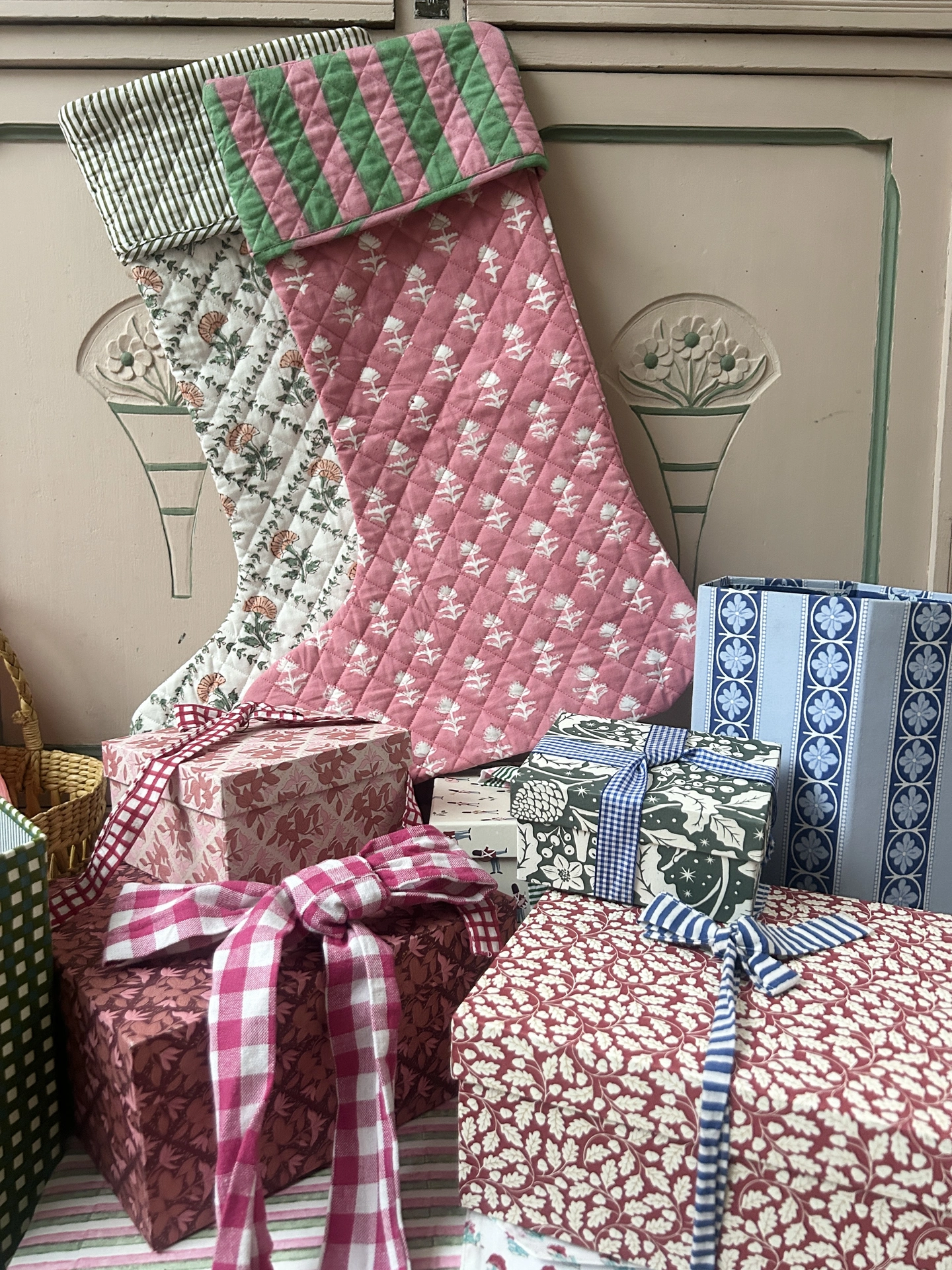 Our quilted stockings are exclusively hand block printed in Jaipur onto the cambric cotton by a small team of tailors. The motif is contrasted by the stripe which looks rather nice along the cuff. The stockings are lightly quilted and have a little string for hanging.