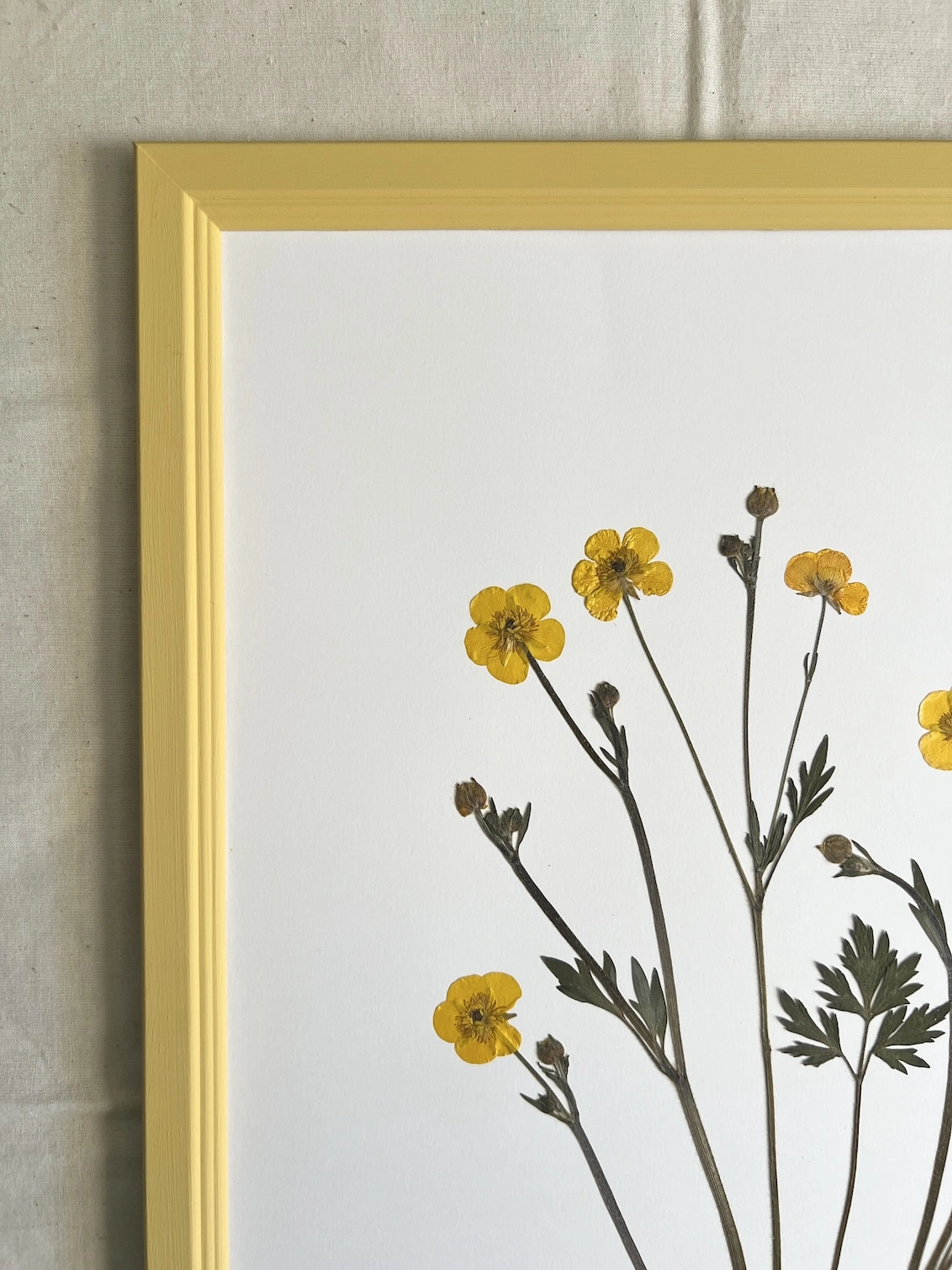 Pressed wild Buttercup flowers that had self seeded in my own garden in London carefully pressed and preserved, are showcased in a beautiful hand painted wooden frame...