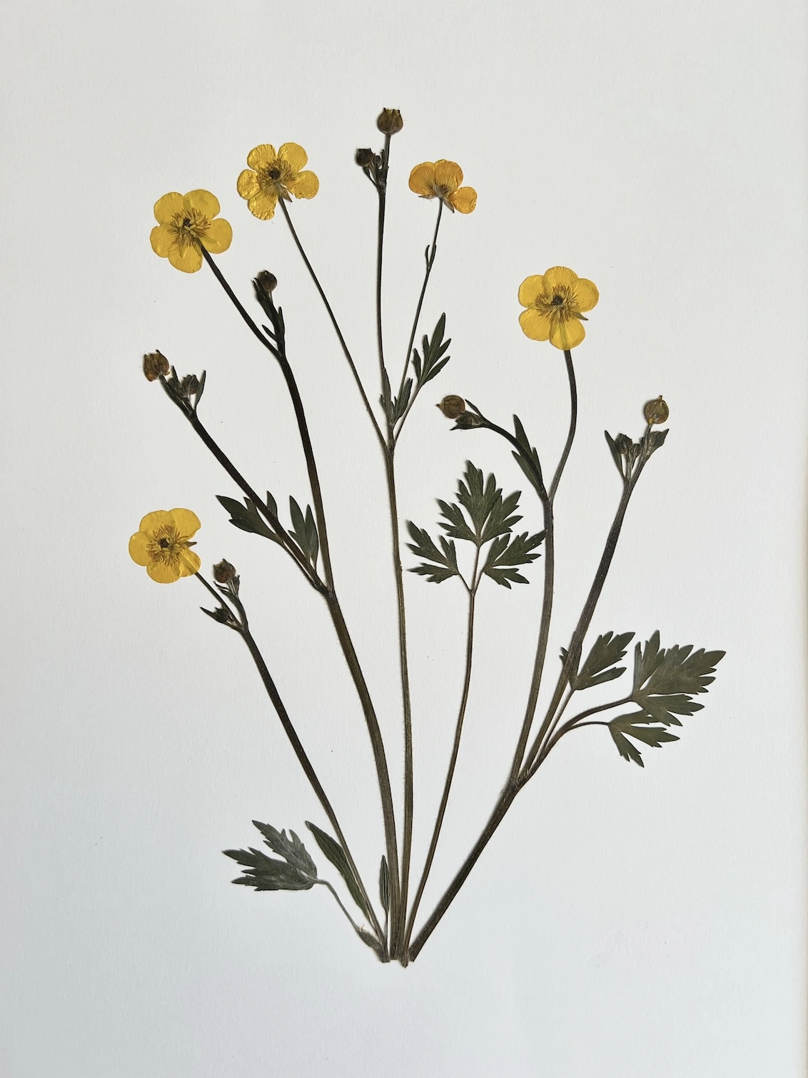 Pressed wild Buttercup flowers that had self seeded in my own garden in London carefully pressed and preserved, are showcased in a beautiful hand painted wooden frame.