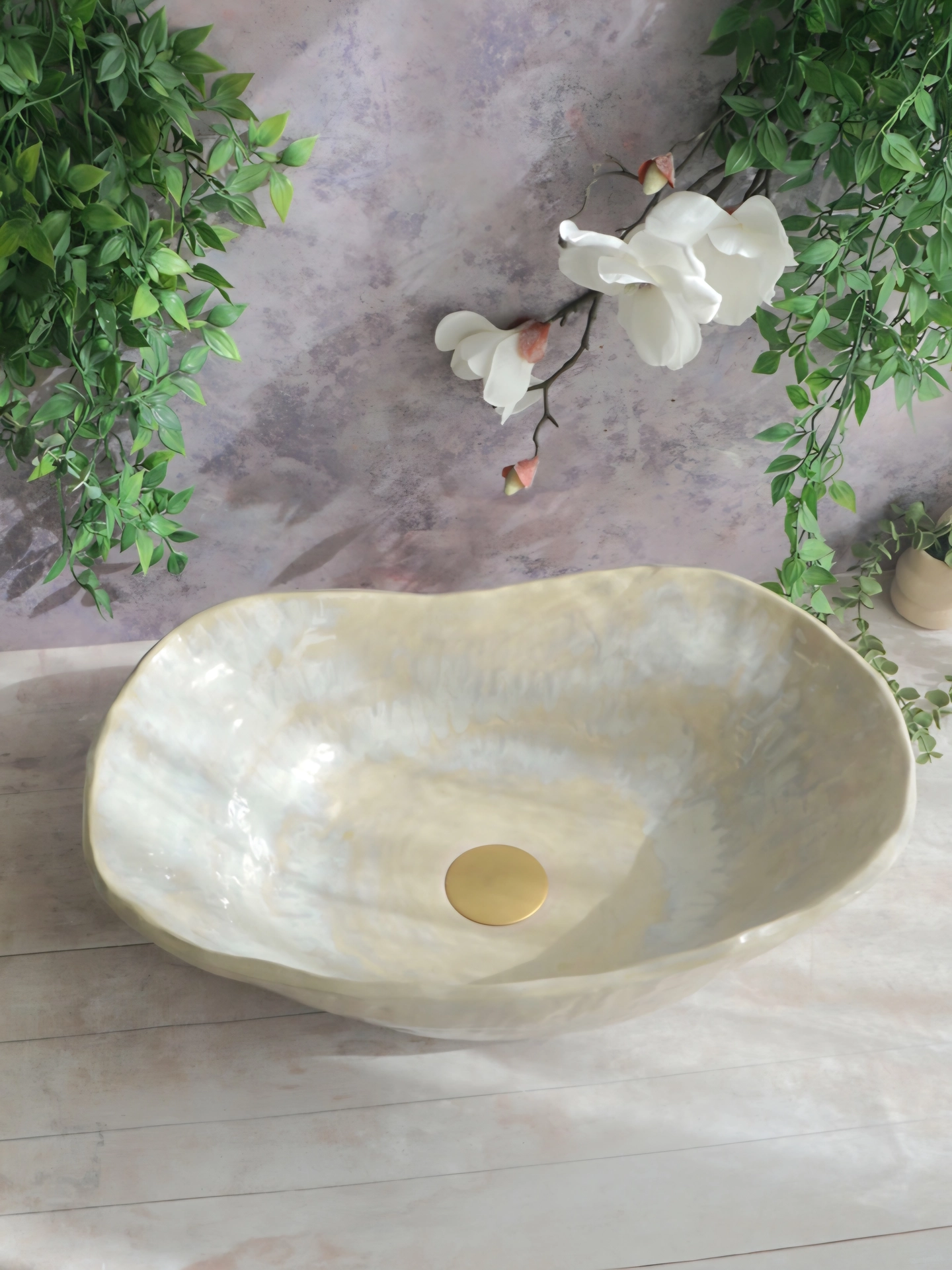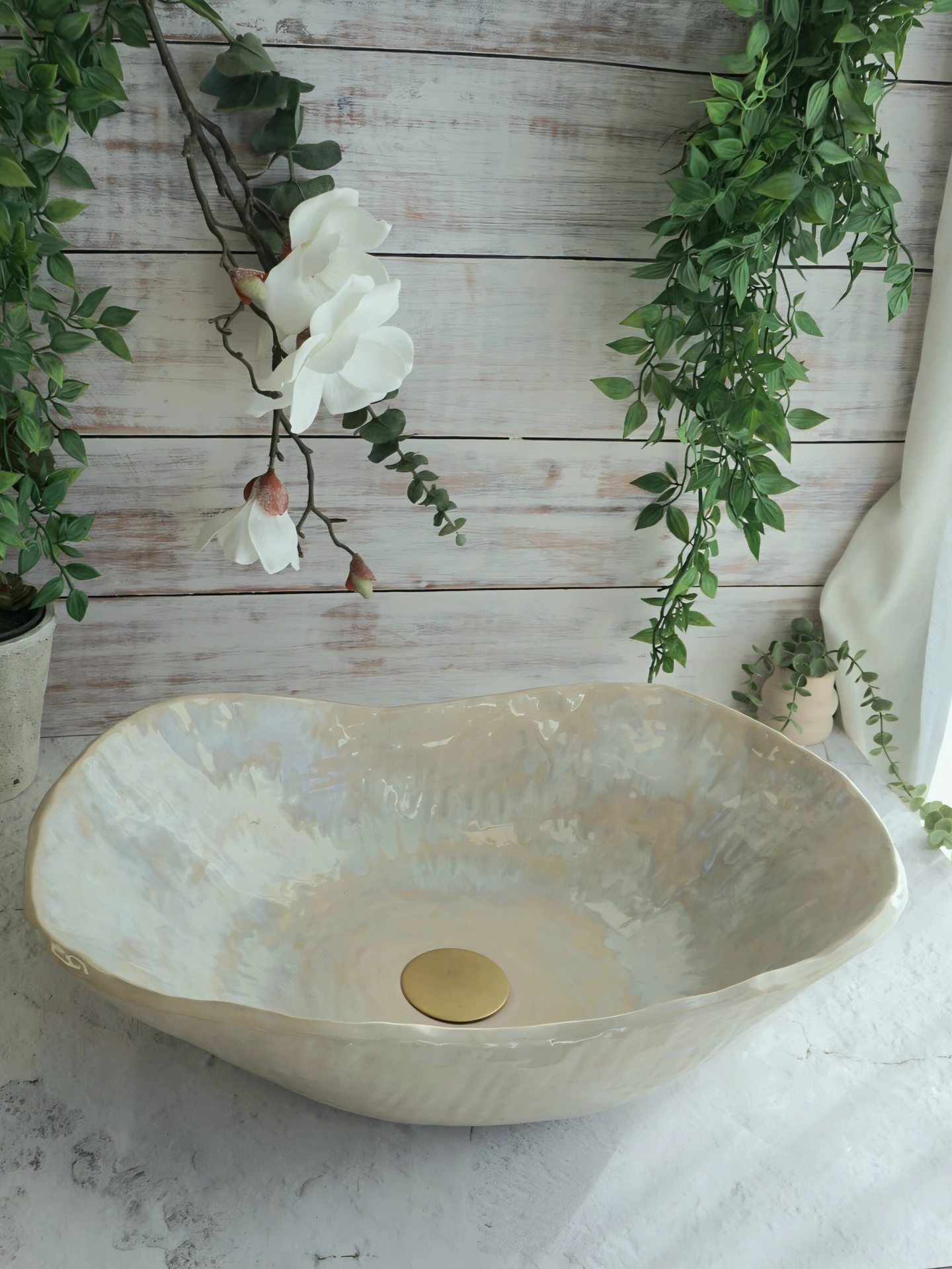 A stunning large handcrafted ceramic bathroom basin / sink, made from stoneware clay, and finished in 'Dream Catcher' glaze. This sculptural ceramic basin is elegant yet durable, and the glaze colour mimics the subtle tones of a shell; with creams, whites, light pinks and hints of gold metallics. This basin / sink is designed to sit atop a bathroom surface and will add a touch of glamour to any contemporary bathroom or WC.