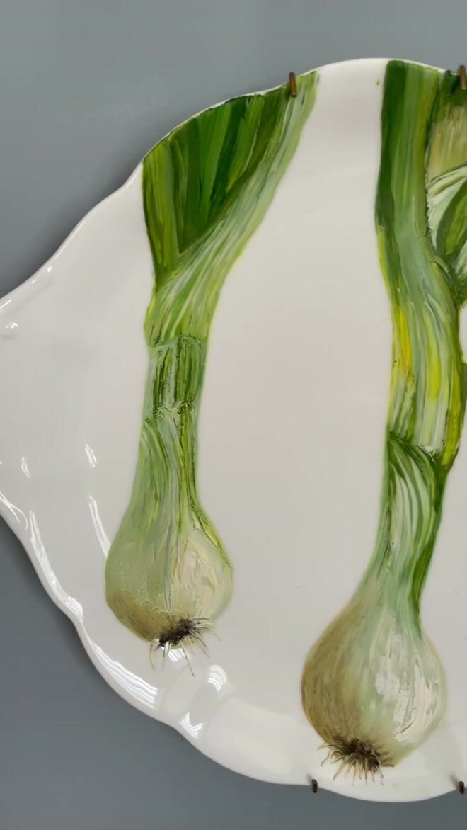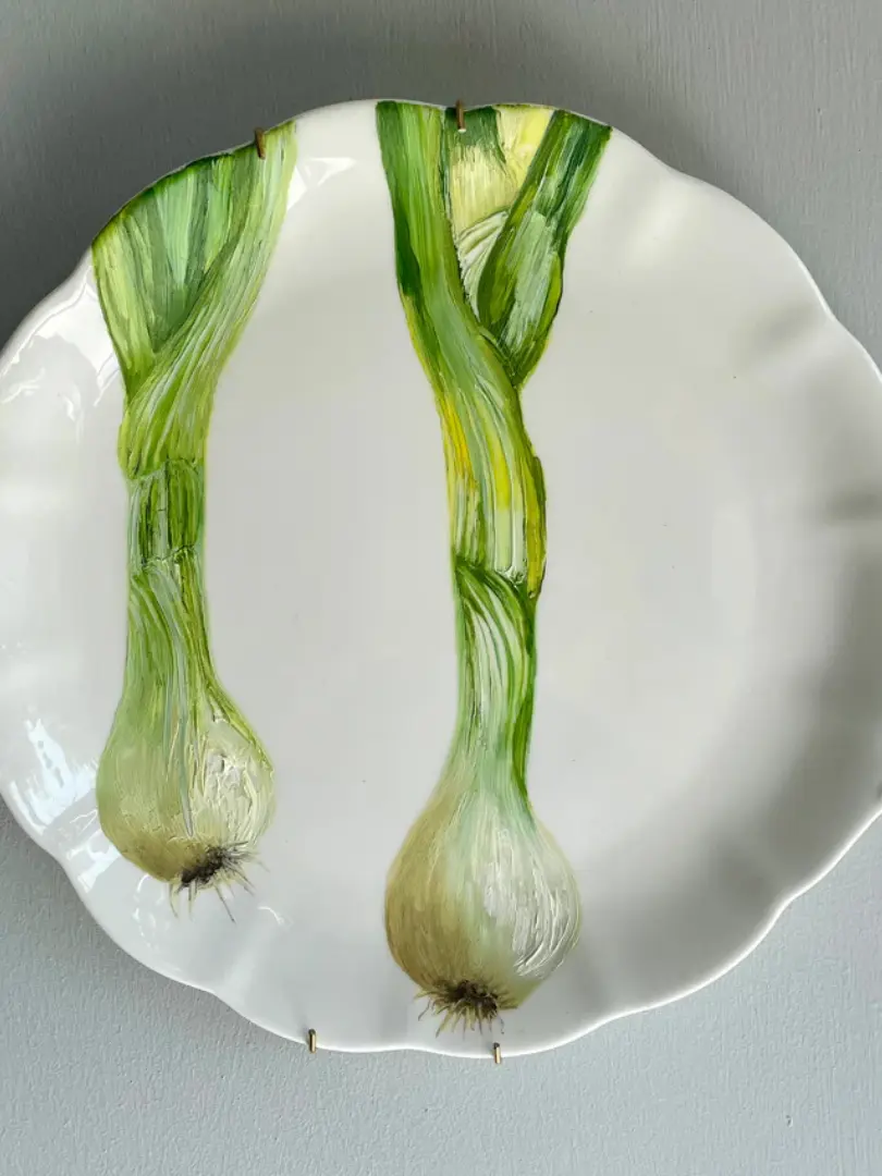 An original fine art painting featuring a two large spring onions. Oil painting by renowned artist Jac Scott, on a vintage cake plate.