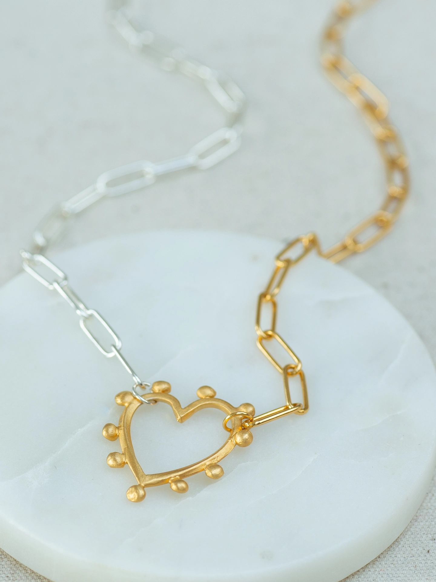The Large Studded Heart Necklace is a bold expression of love and individuality. Featuring a beautifully textured studded heart charm suspended from a mixed metal paperclip chain, this statement piece balances strength with softness. Designed to stand out...