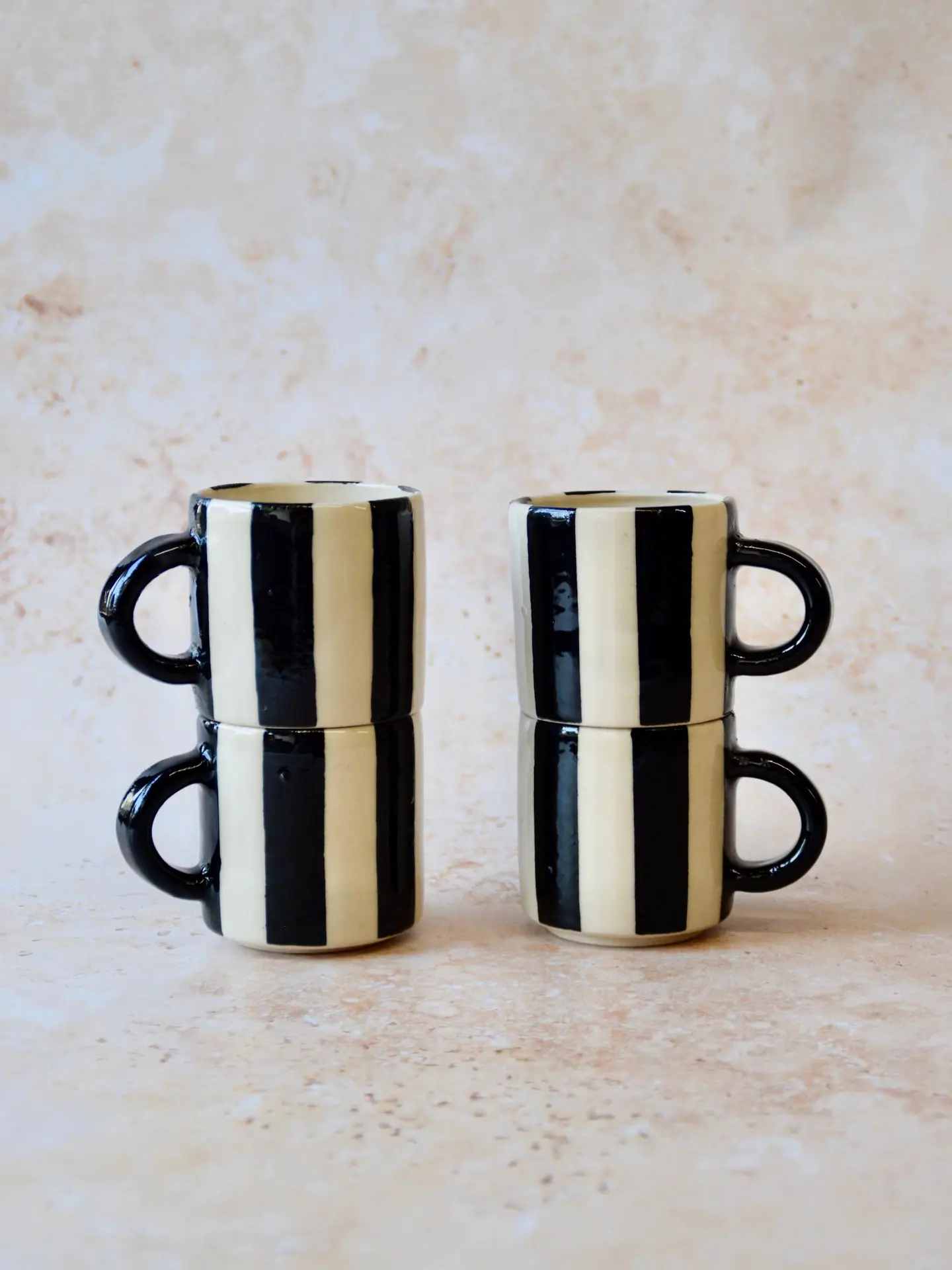 Available in classic black & cream or a limited-edition wild stripes, each cup is individually made with care, glazed by hand and finished with a glossy shine. No two are identical, that’s part of the charm.