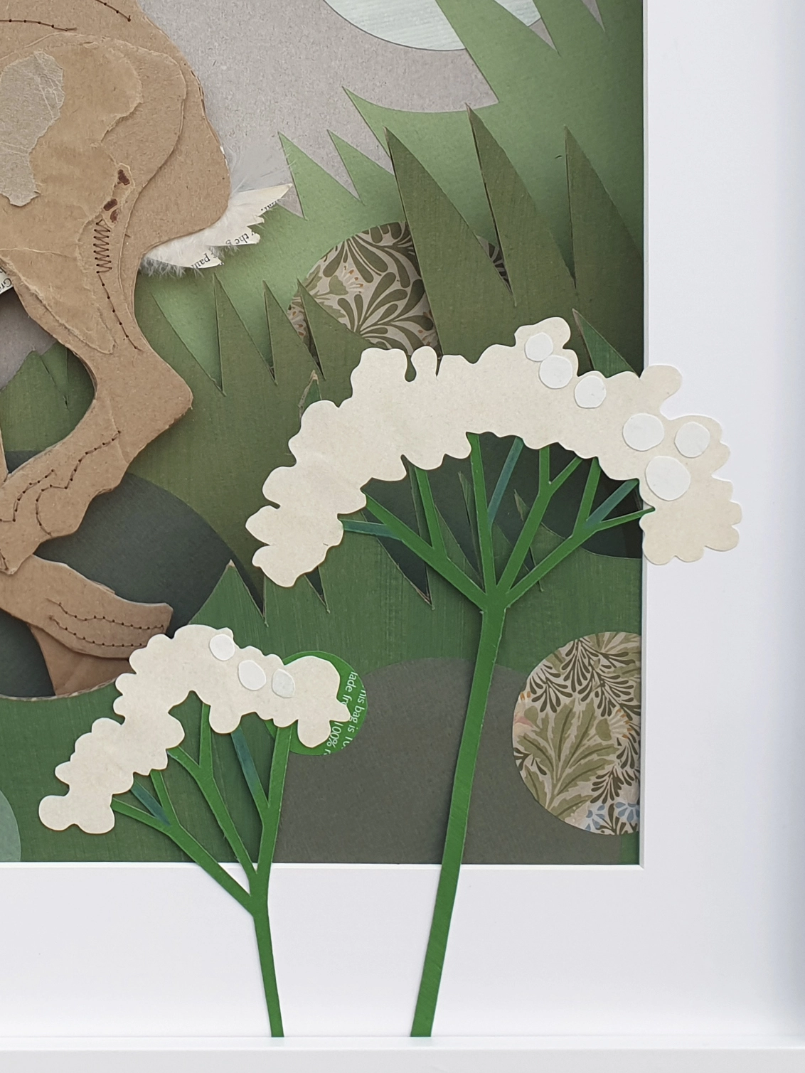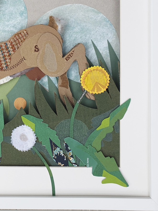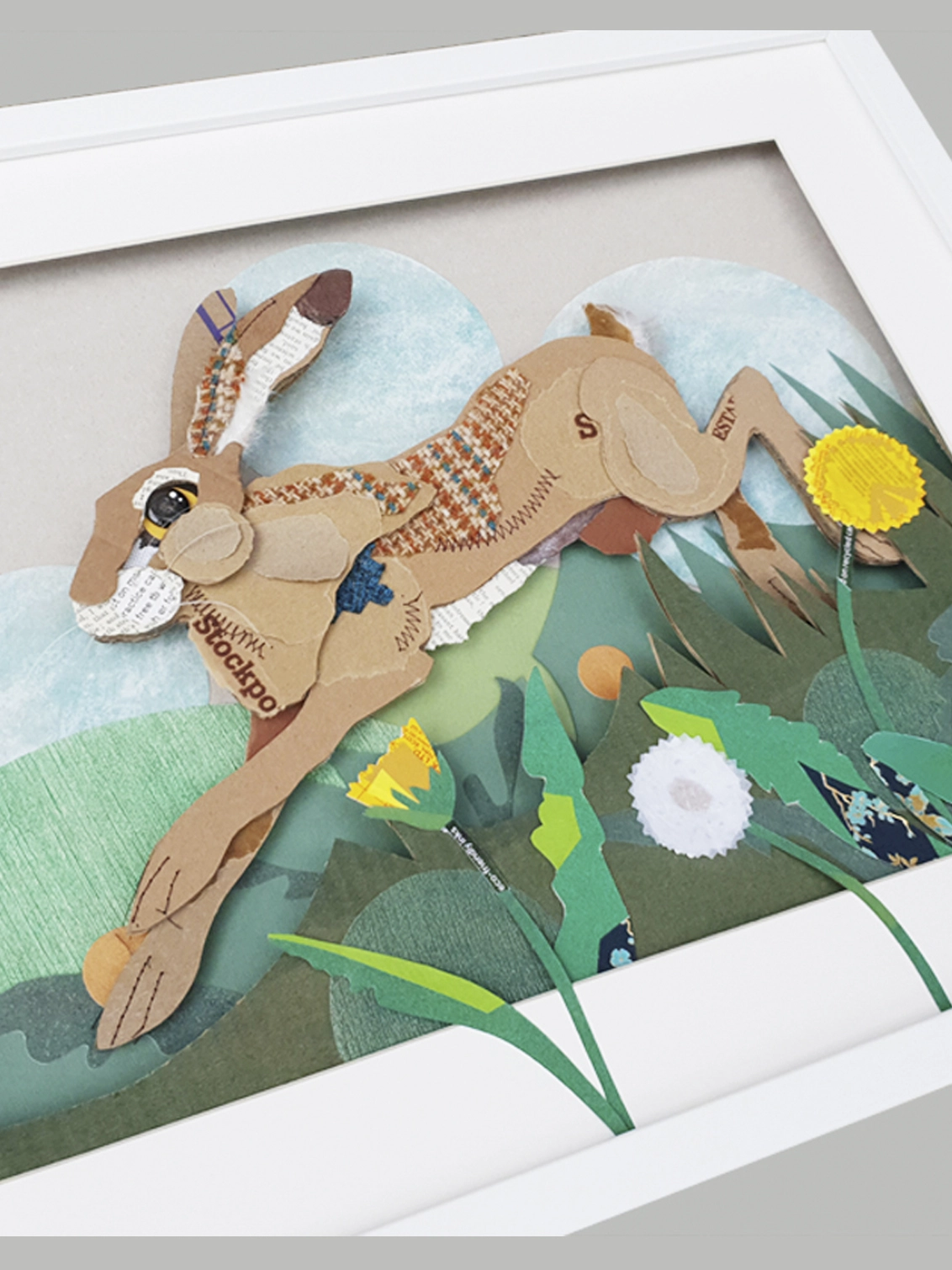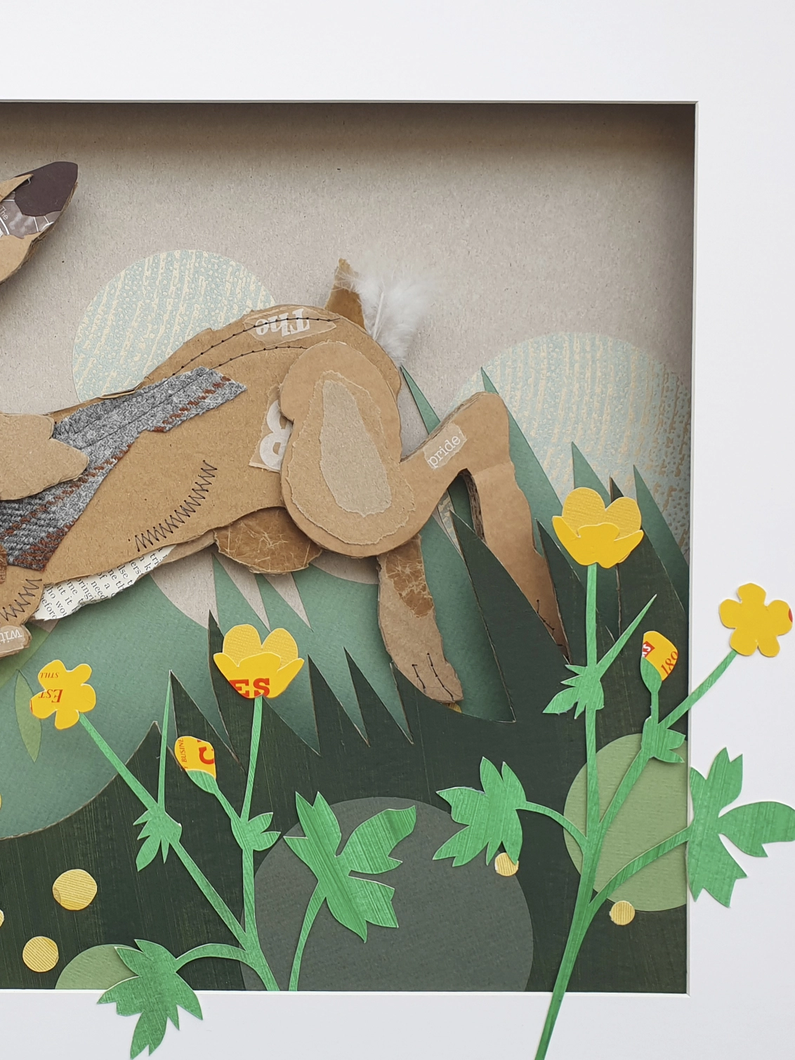 One of the most iconic wild animals found in Britain, this mixed media leaping hare is created using a wide range of salvaged materials from salvaged Harris tweed scraps to old encyclopaedia pages. Primarily made from corrugated card she is embellished with paper and fabric collected from end of season sample books, recycled buttons, both machine and hand sewn highlights.