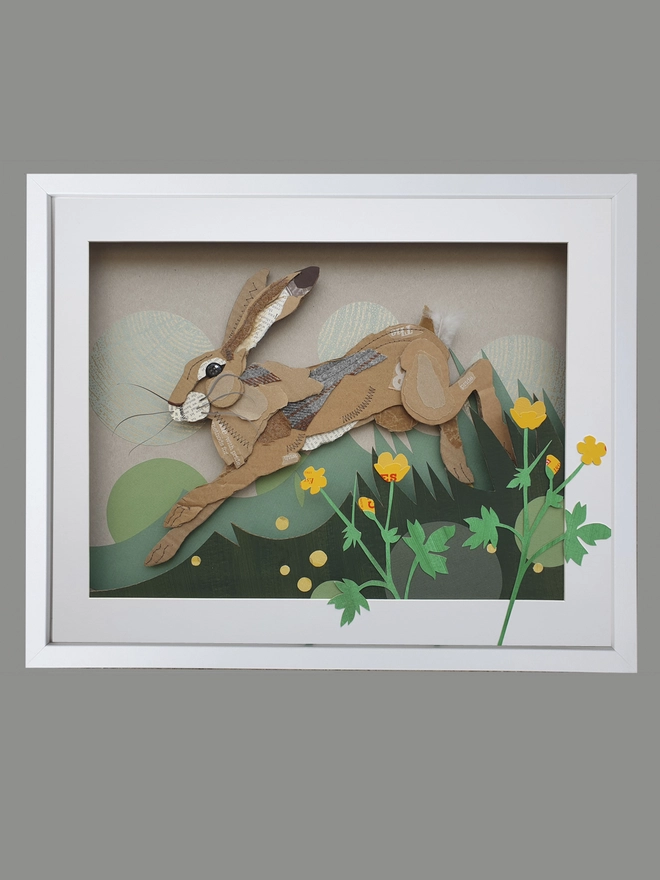 One of the most iconic wild animals found in Britain, this mixed media leaping hare is created using a wide range of salvaged materials from salvaged Harris tweed scraps to old encyclopaedia pages. Primarily made from corrugated card she is embellished wi...