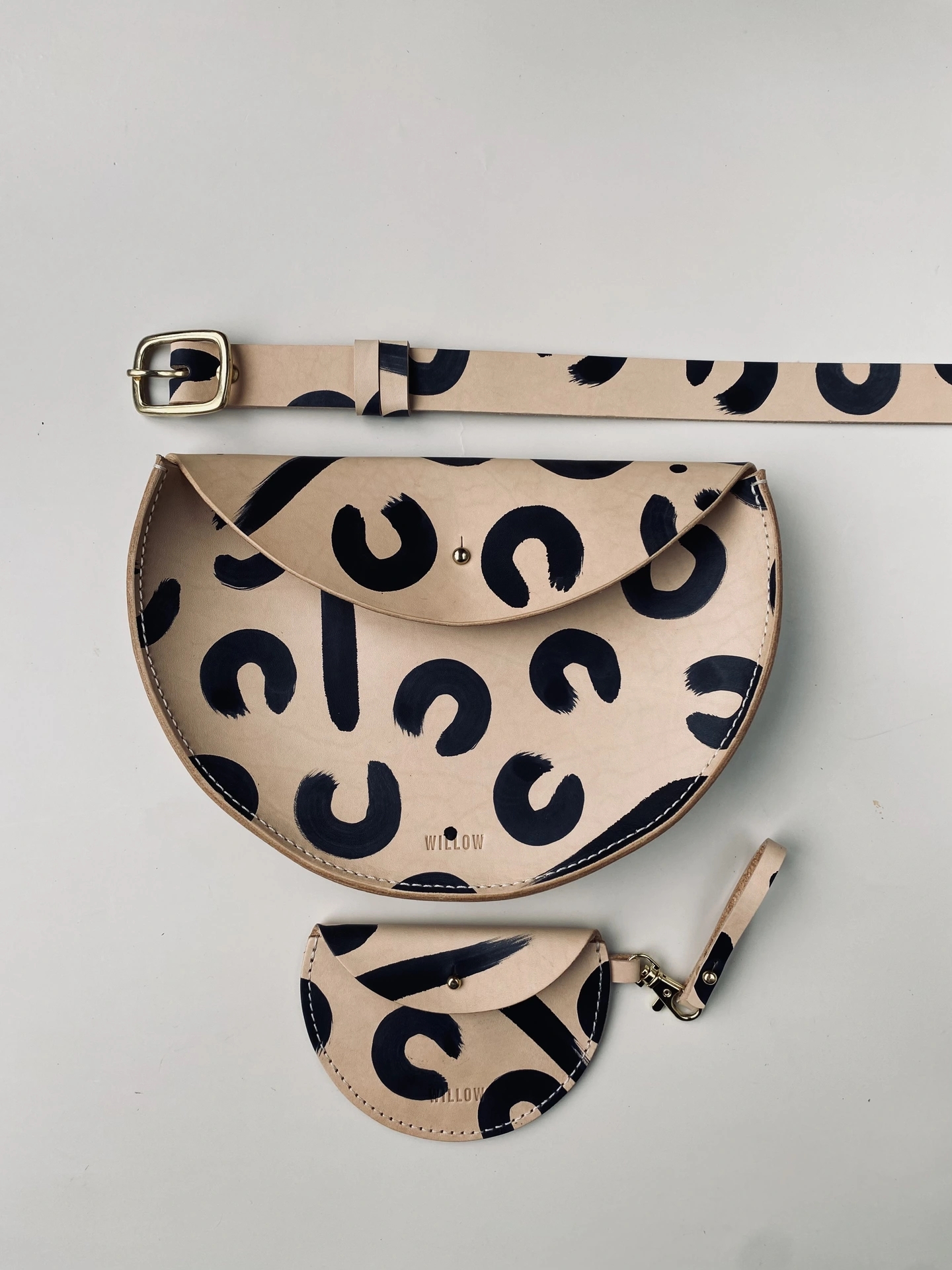 These mini halfmoon purses are hand painted with my distinct leopard pattern which remains popular and are designed to attach to the halfmoon bags by attaching the purse to the inside strap of the halfmoon bags. You can also attach the mini moon purse on other bags such as the handles or to a keyring. It's the perfect size to fit in your bag and can hold cards, cash or other items like jewellery.