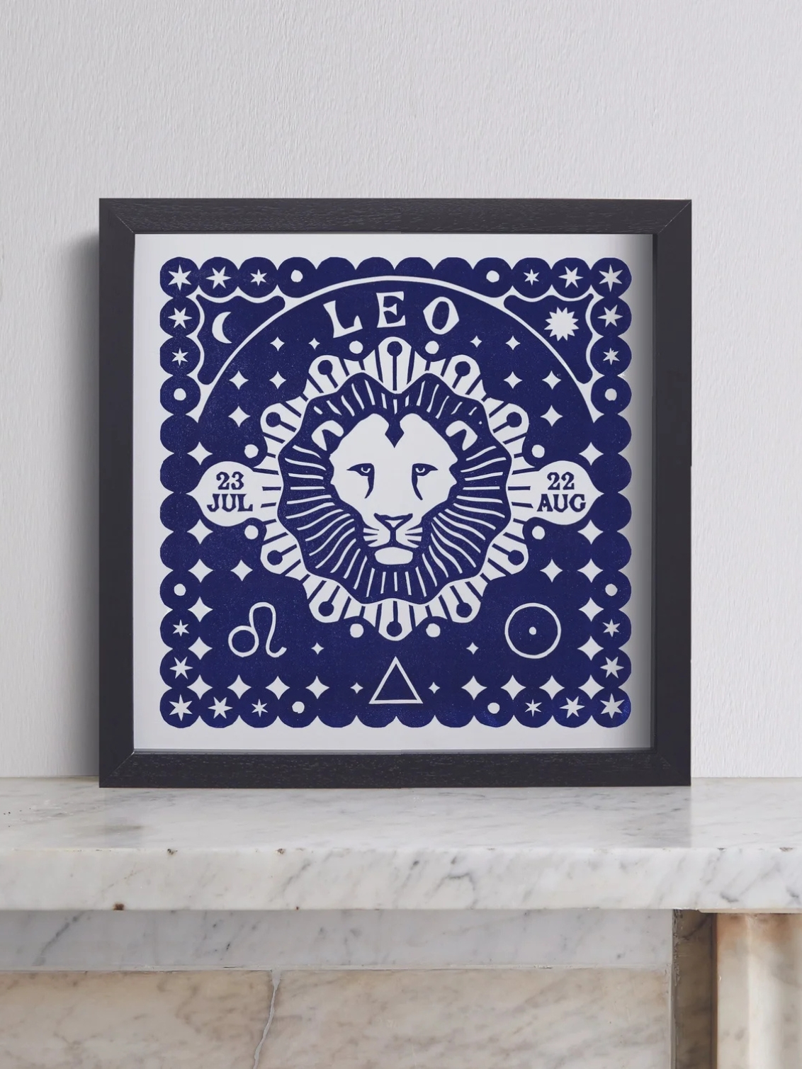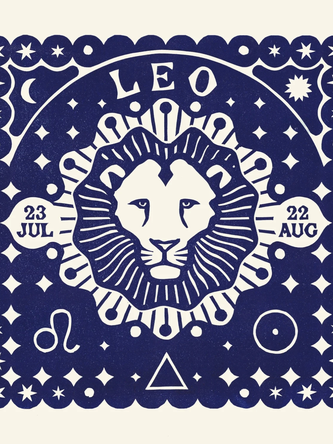 Shown on this print is an approximate date span for Leo of July 23 – August 22. The dates may vary slightly each year due to Earth's orbit and leap years, so those born near the start or end should check their birth chart to confirm their sign.