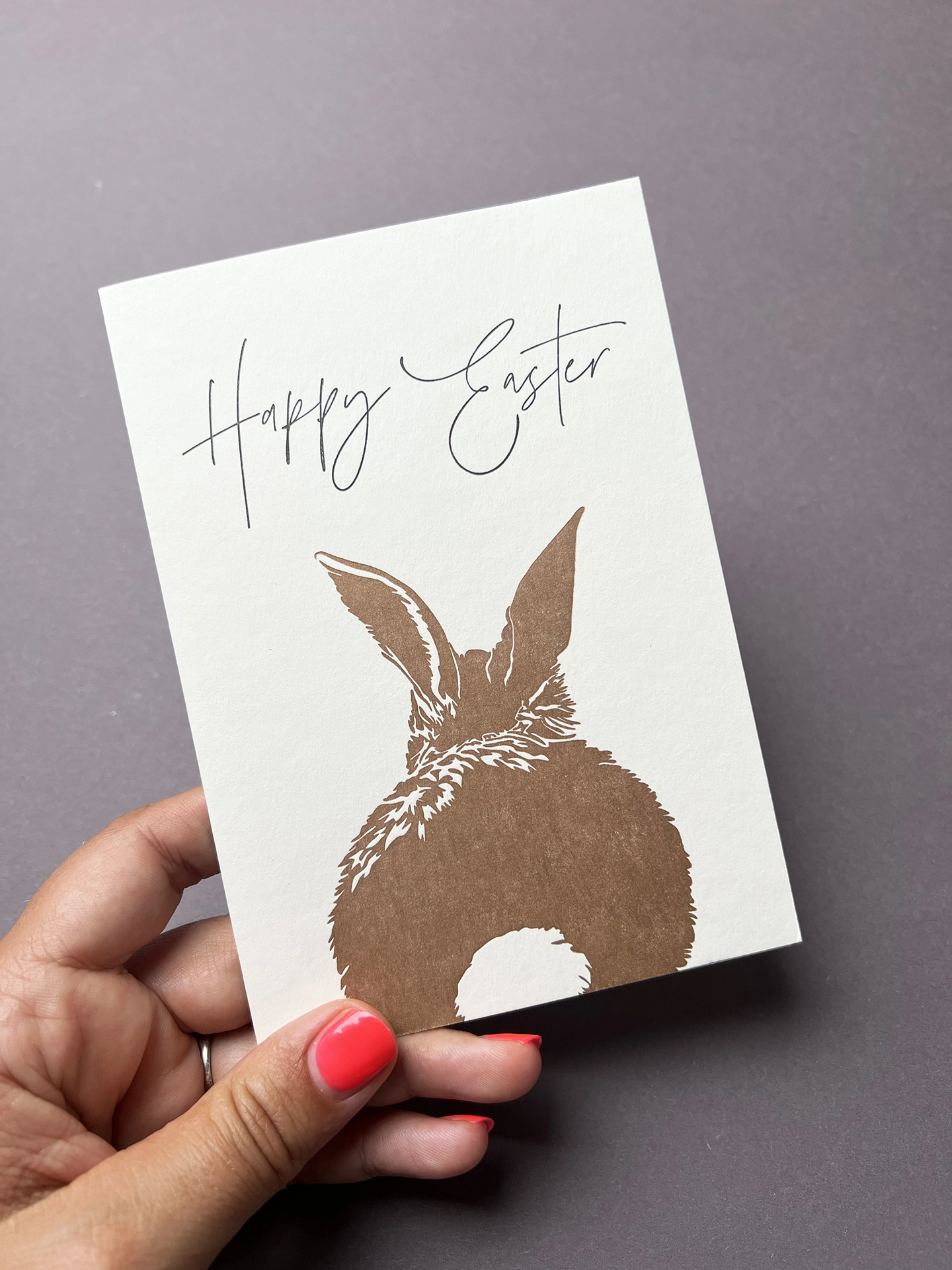 This gorgeous letterpress greeting card, Easter Bunny, is illustrated with a cute Bunny bottom with it's fluffy tail, sat at the bottom of the card. Printed in bronze with modern calligraphy “Happy Easter” written above the Bunny's ears. Perfect for sending this Easter.