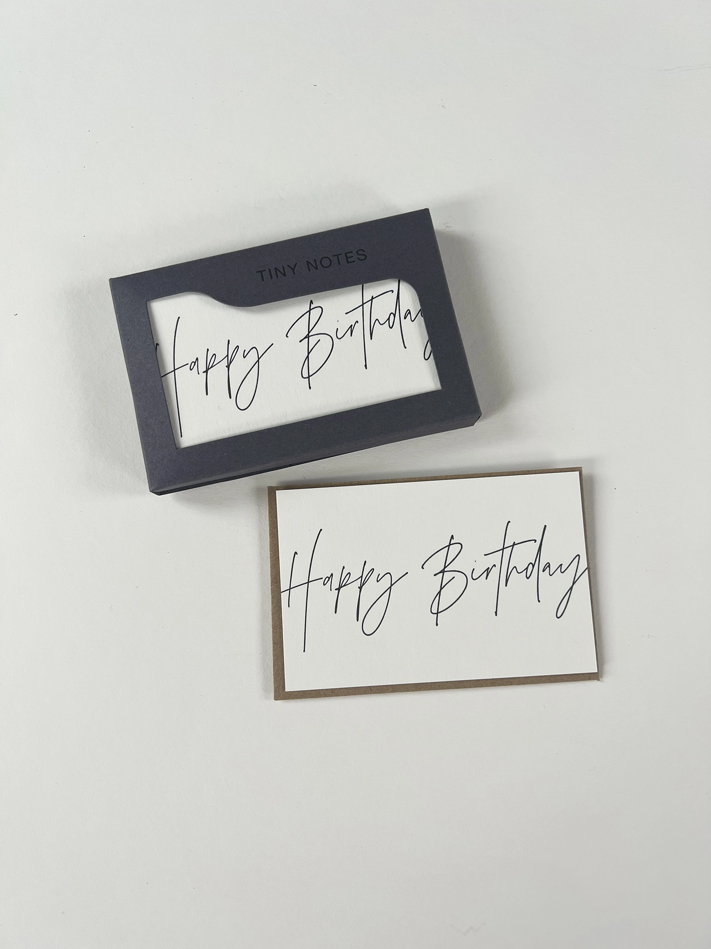 Gorgeous letterpress printed tiny notes in black illustrated with happy birthday written in modern calligraphy, presented in a little letterpress printed box with kraft envelopes. Our Tiny Note cards are small flat cards, made from the offcuts of our larg...