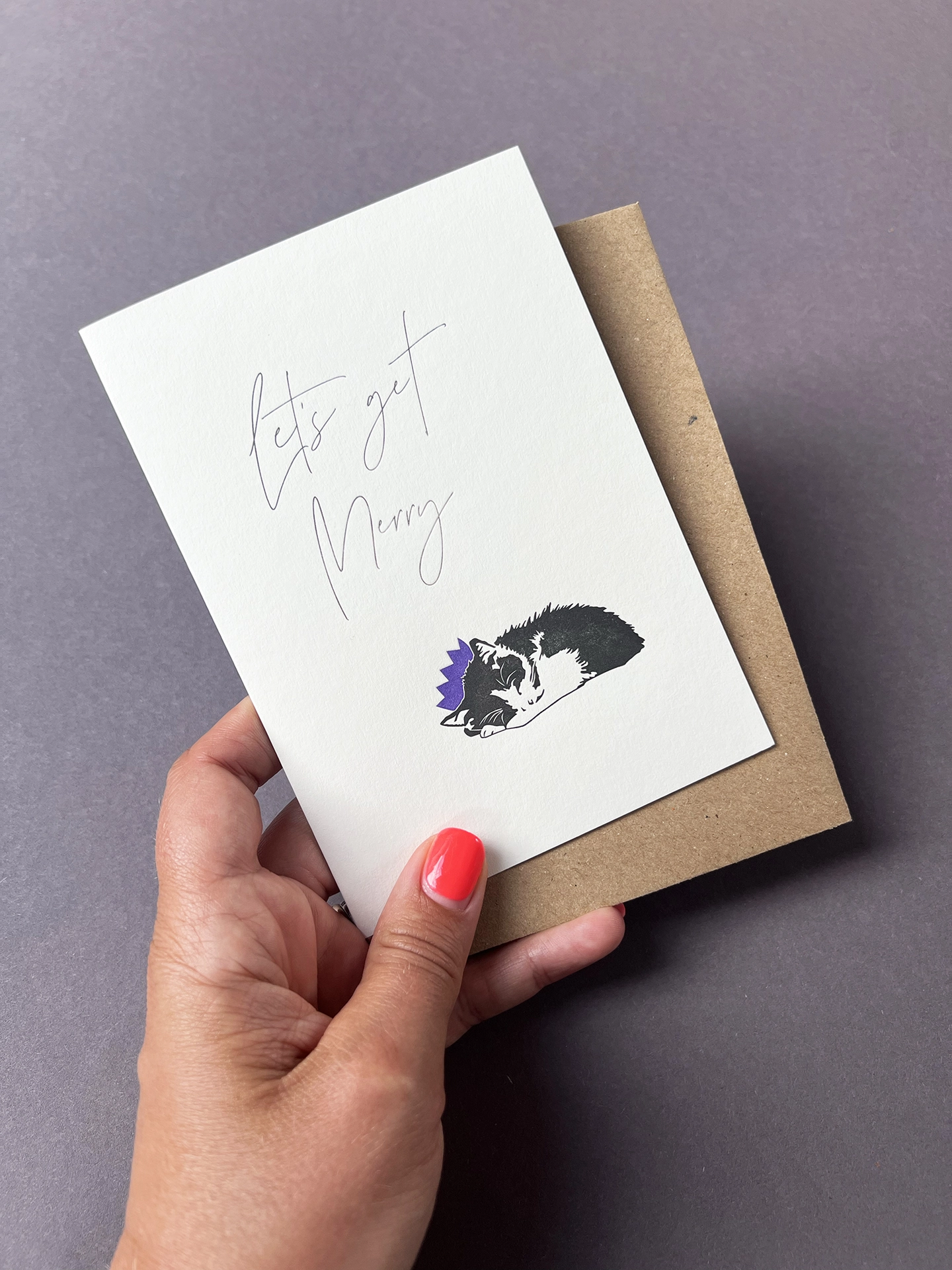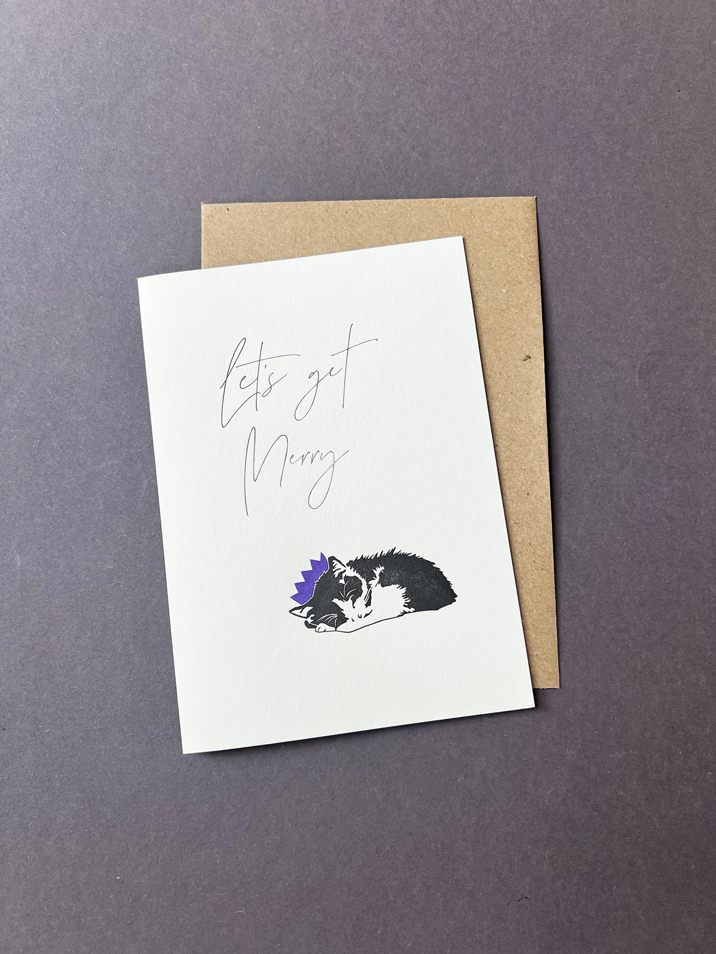 Letterpress "Let's get merry" Christmas cat Greetings Card