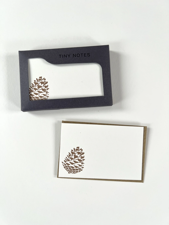 Gorgeous letterpress printed tiny notes in metallic gold illustrated with a pine cone, presented in a little letterpress printed box with kraft envelopes. Our Tiny Note cards are small flat cards, made from the offcuts of our large cards, allowing us to reduce our waste. Perfect for little messages, thank you cards, place settings, and gift tags.