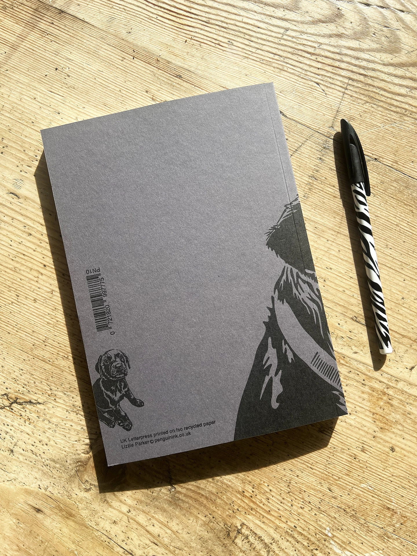 Our gorgeous letterpress Labrador notebook has a luxury letterpress printed cover. Featuring a close up of a Labrador head on the front and a cute little puppy on the back. The cover is printed in black on charcoal grey board, with white lined pages. The perfect notebook for any Labrador lover.