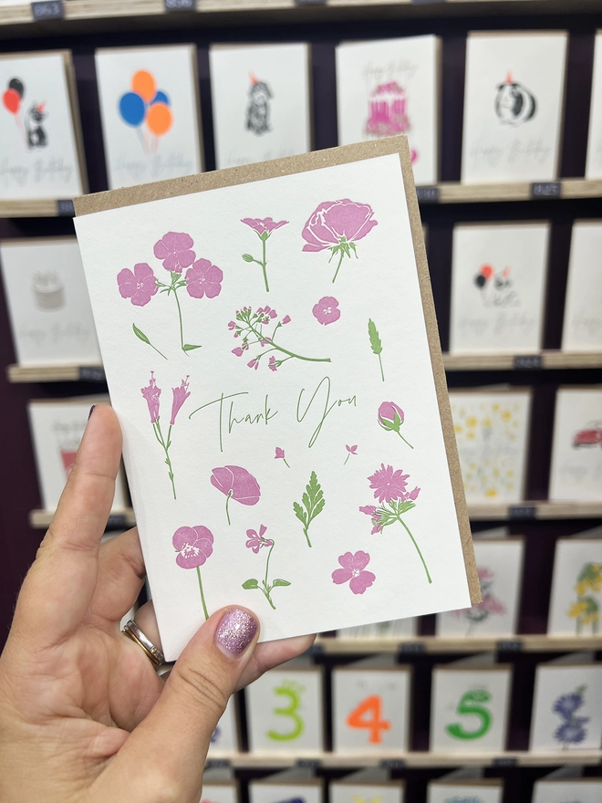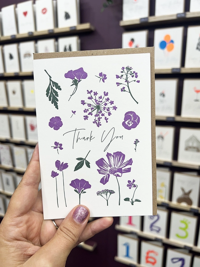 A selection of floral Thank you cards. All cards have the words "Thank you" beautifully written in a modern calligraphy in the middle with flowers scattered around it. We have it in Four different colours Blue, Pink, Yellow and Purple.