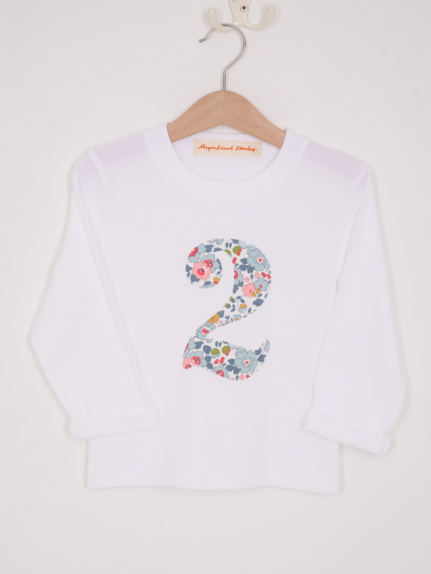 This super tee features our most popular iconic Betsy Grey Liberty Print. These beautifully soft white 100% cotton t-shirts are kind to delicate skin. They are lovingly hand appliquéd with a number 2. Each number is hand cut and sewn onto the tee, making each one individual & unique.