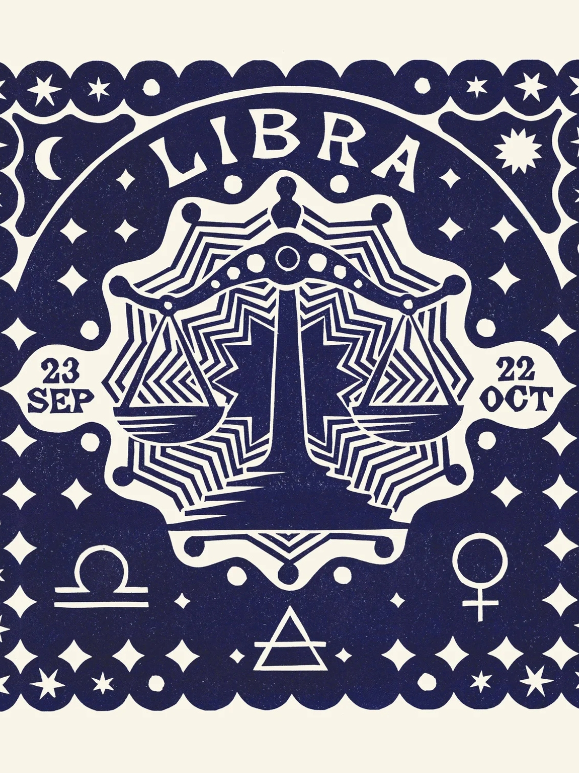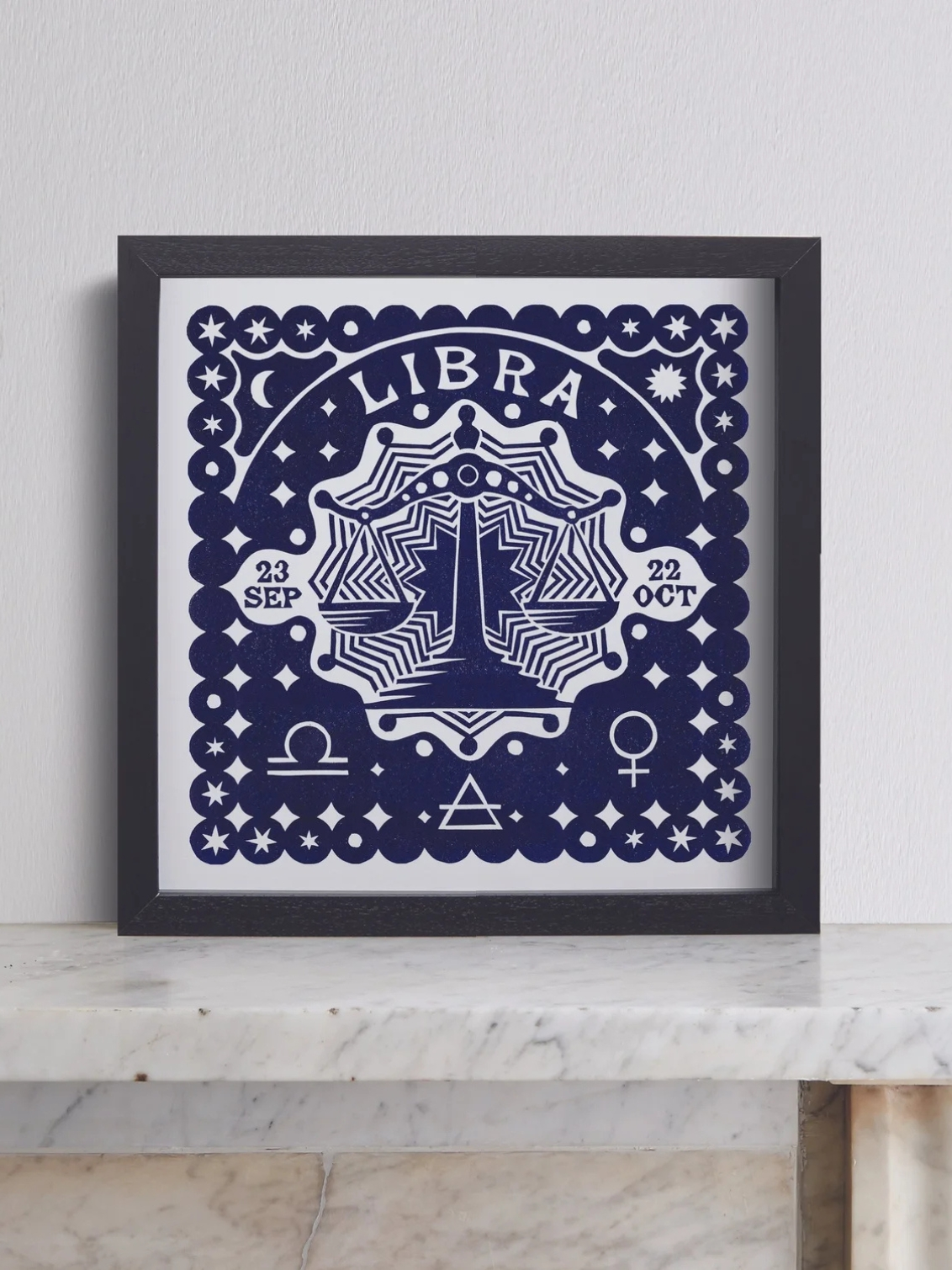 Shown on this print is an approximate date span for Libra of September 23 – October 22. The dates may vary slightly each year due to Earth's orbit and leap years, so those born near the start or end should check their birth chart to confirm their sign.