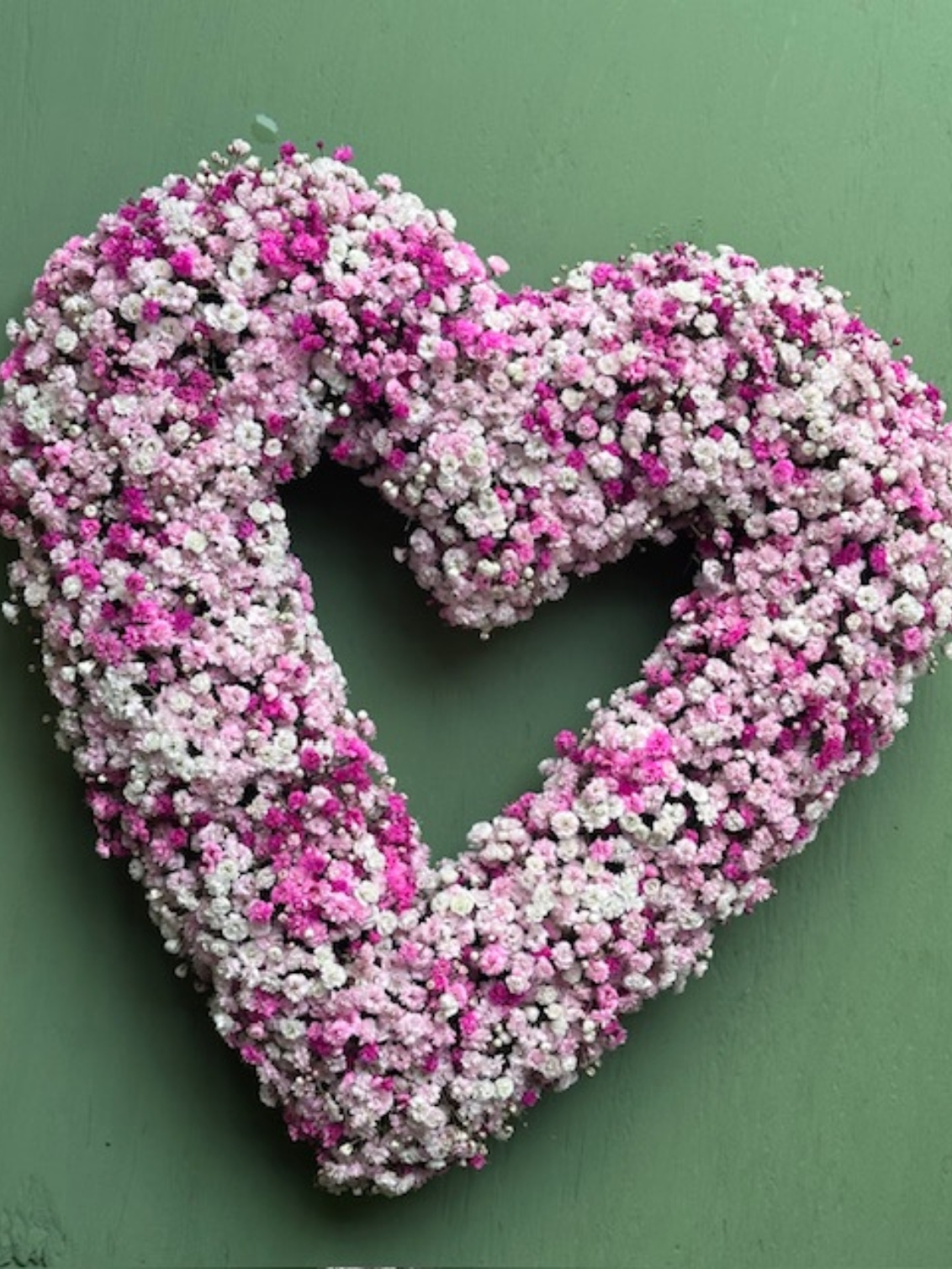 This is how to Romanticise your lilfe, a gorgeous fluffy pale pink wall or door wreath. Made fresh with bundles and bundles of velvety soft Gypsophilia flowers made into a heart shape.