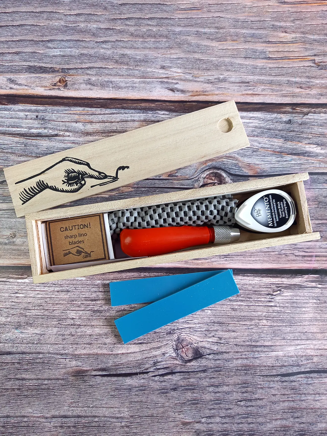 Lino Carving and block printing set in Wooden box - 1 carving tool handle and 5 blades - with anti slip safety mat - with 3 pack of A6 blue soft lino.