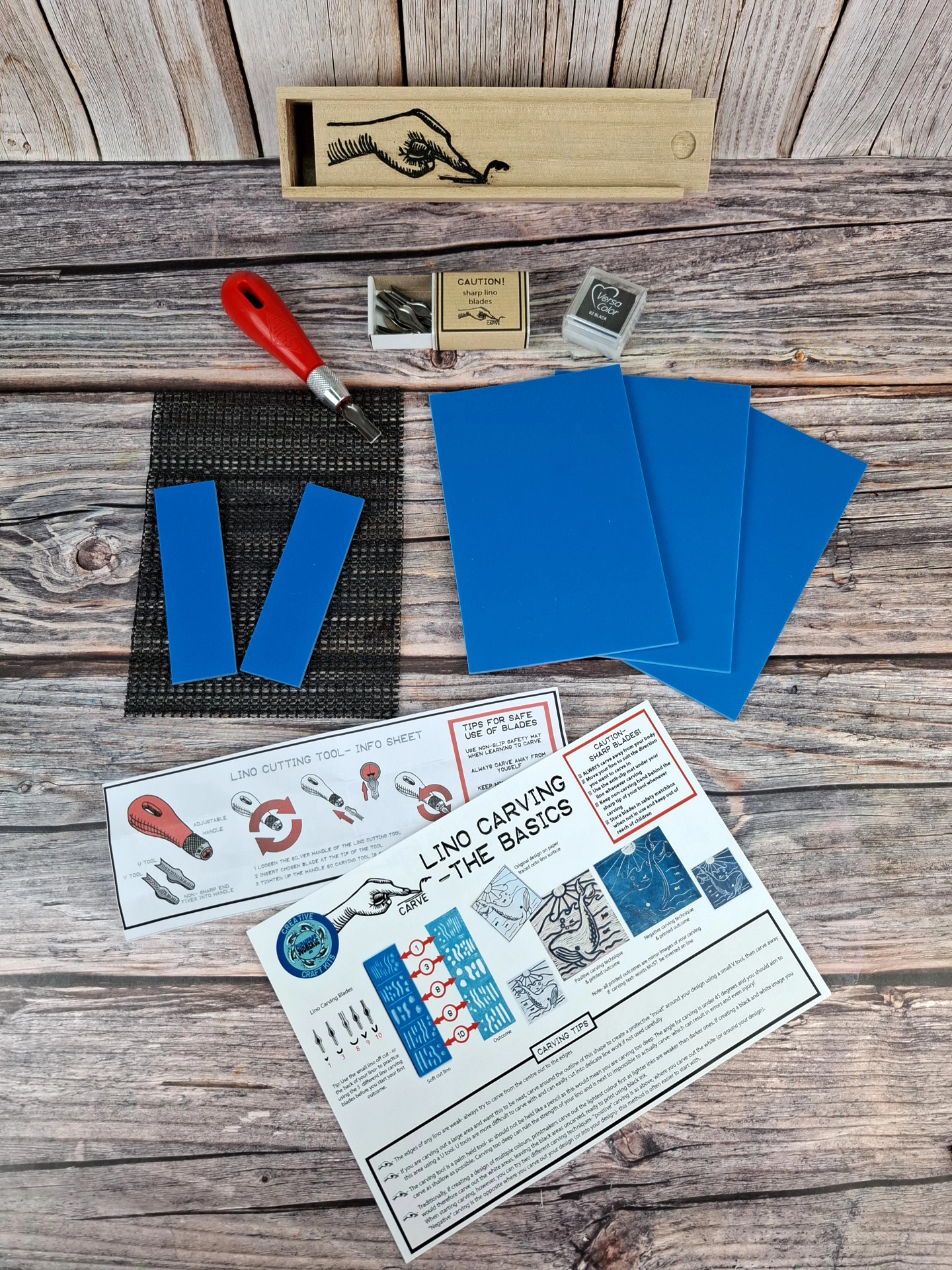 Lino Carving and block printing set in Wooden box - 1 carving tool handle and 5 blades - with anti slip safety mat - with 3 pack of A6 blue soft lino.