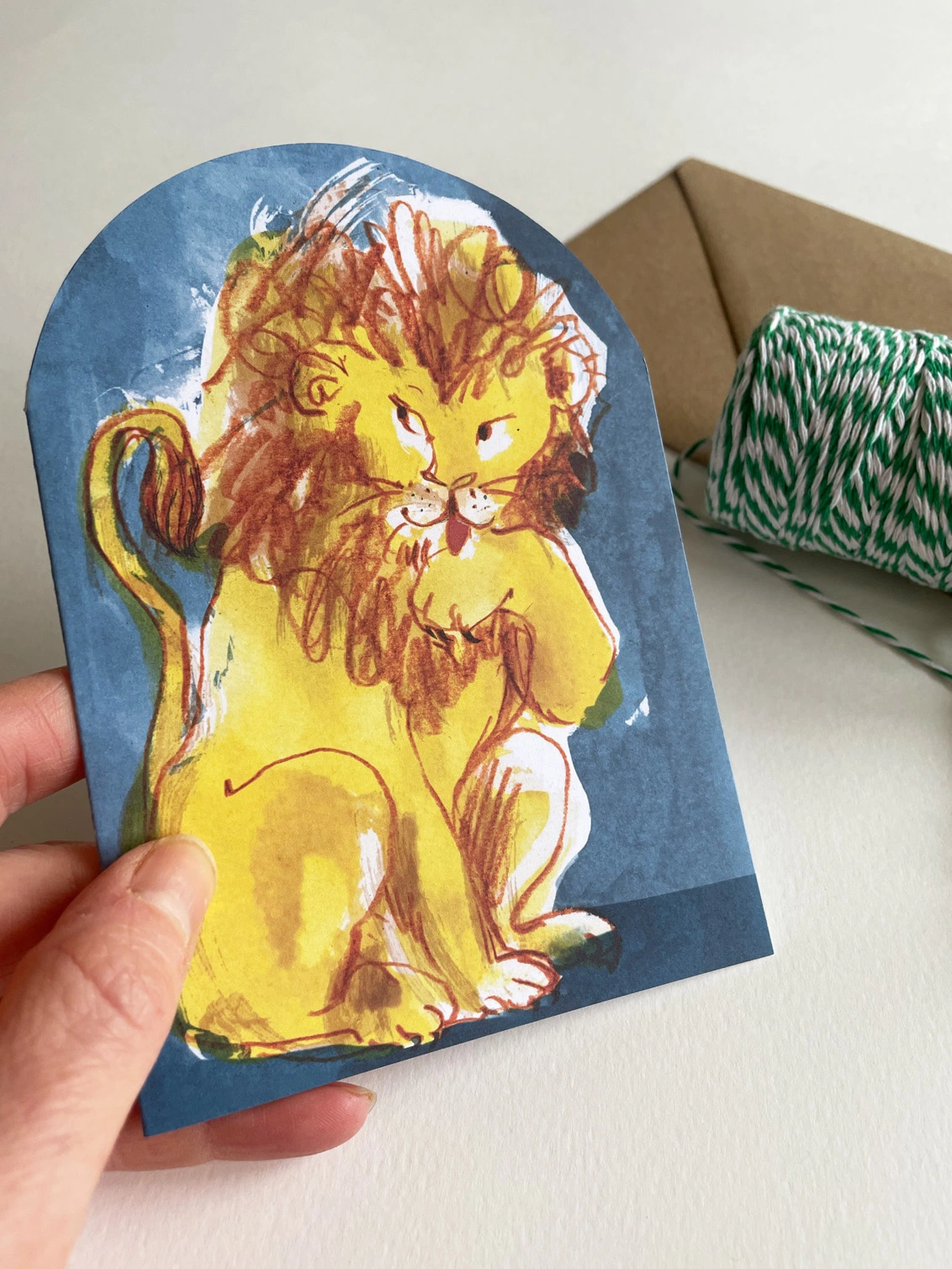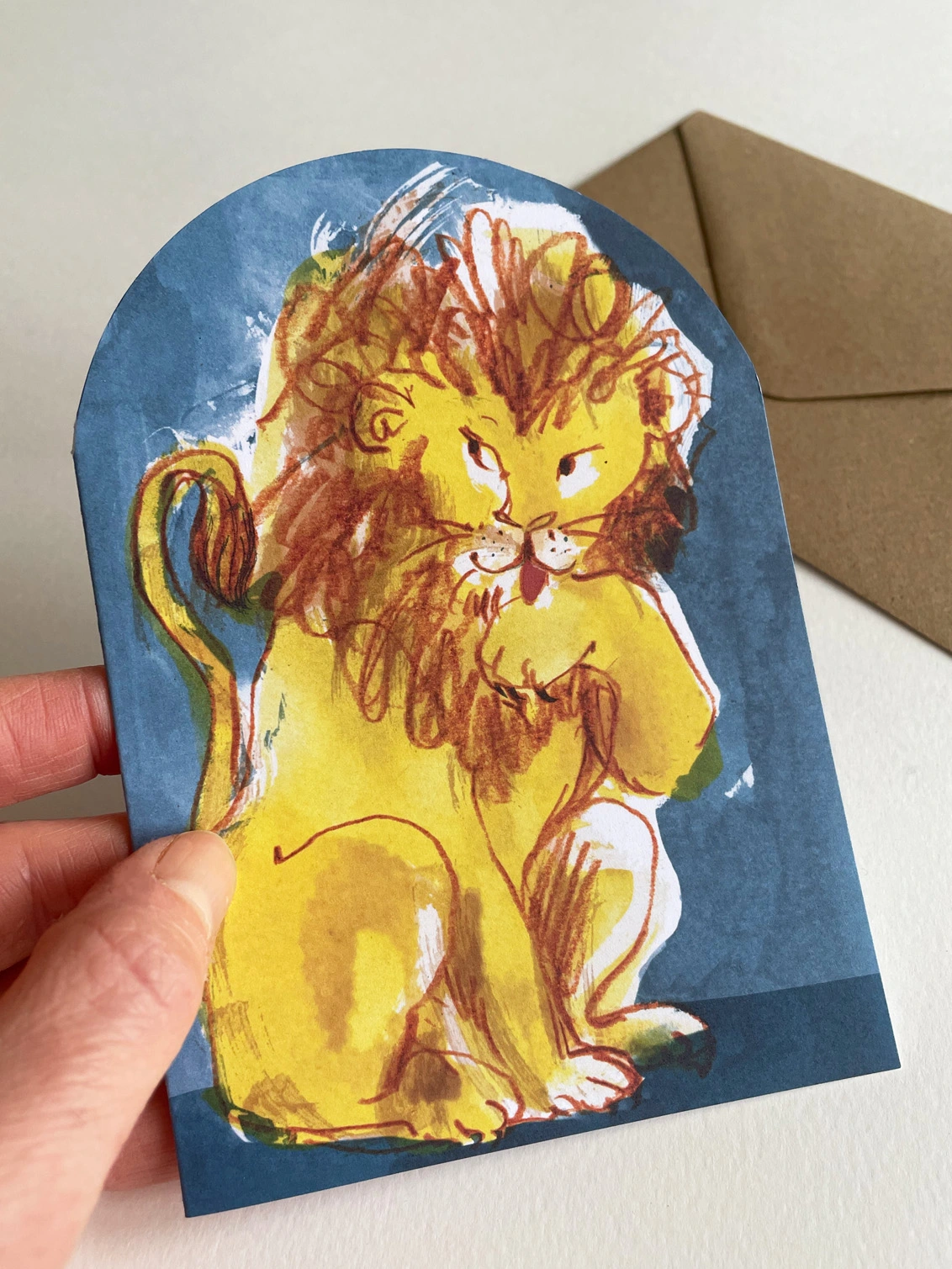 The Lion arch-shaped card is designed to adorn a mantelpiece or shelf long after the message you send has been read and enjoyed. My mixed media and digital illustration is printed on smooth uncoated card stock in the UK, and custom cut to create an extra-special greetings card to treasure.