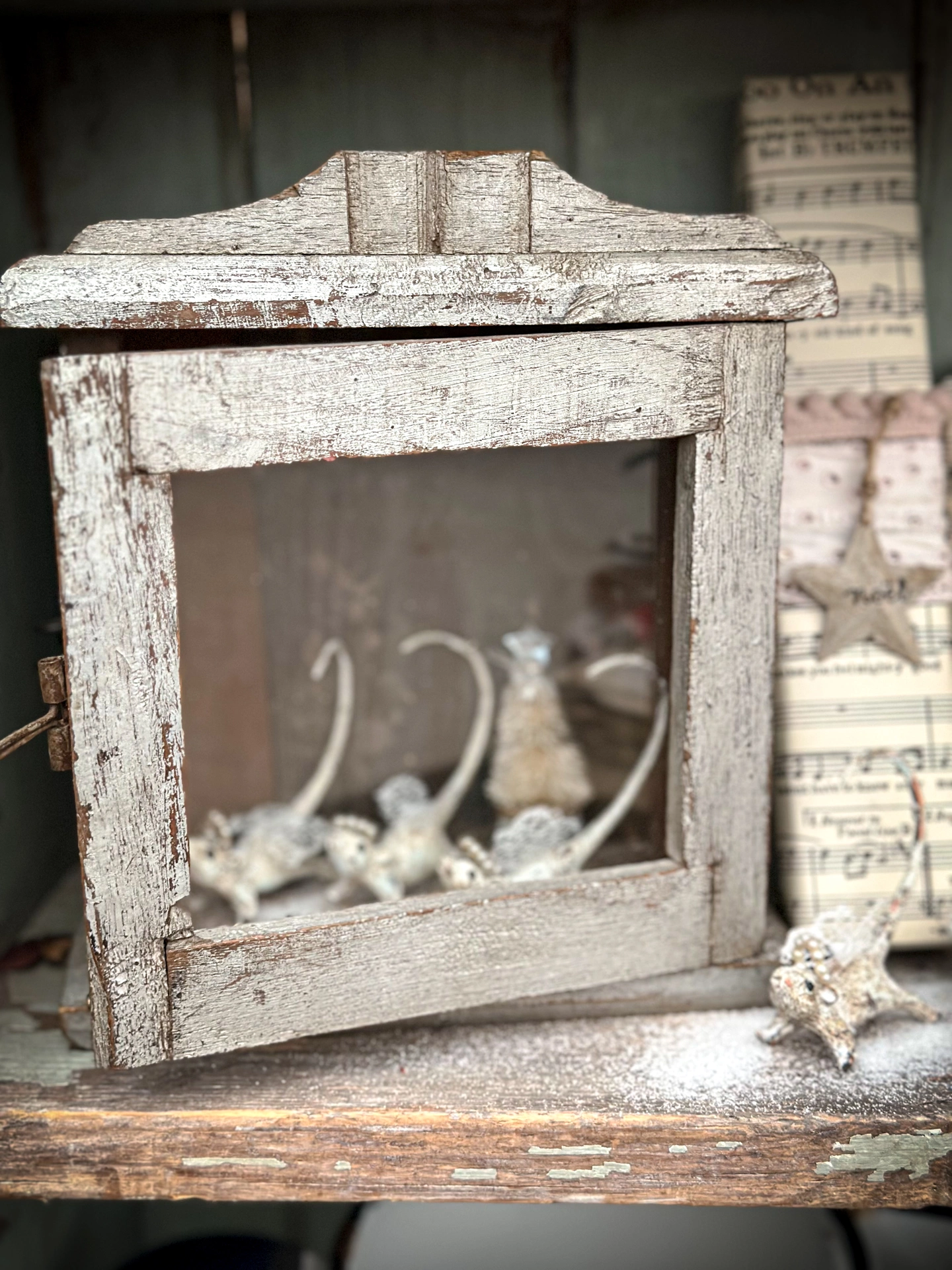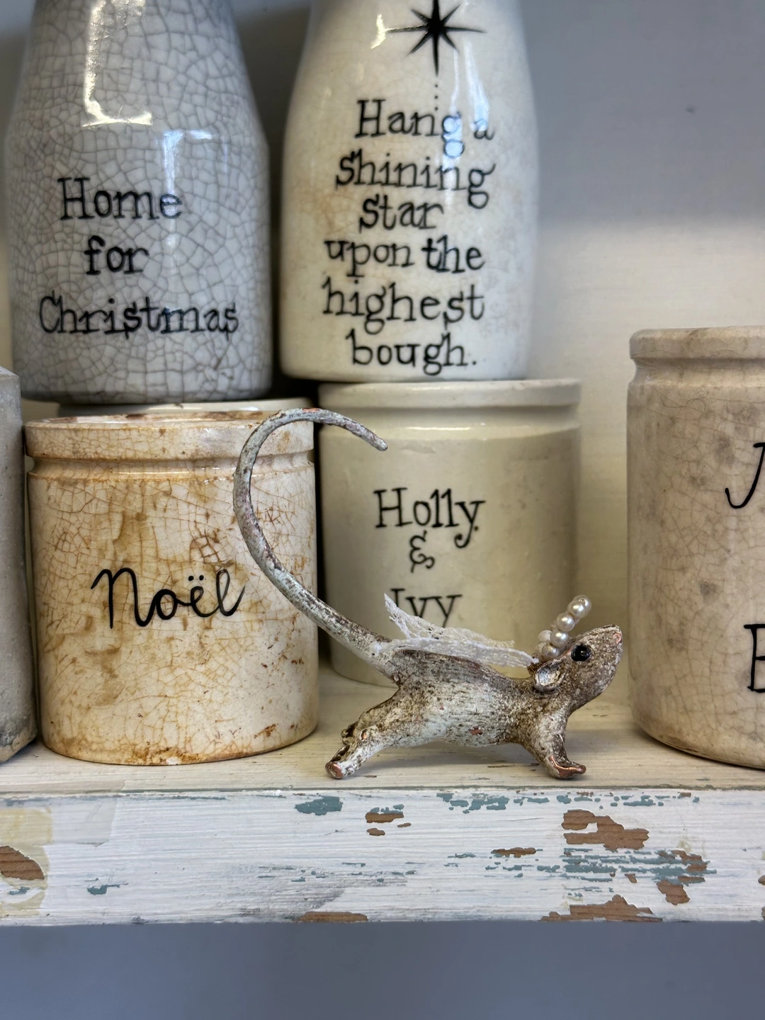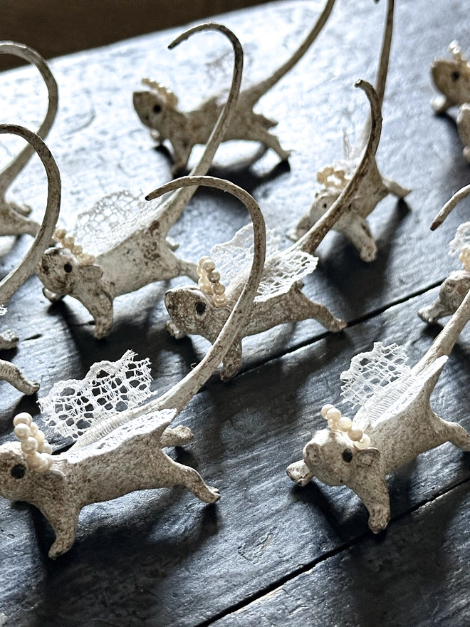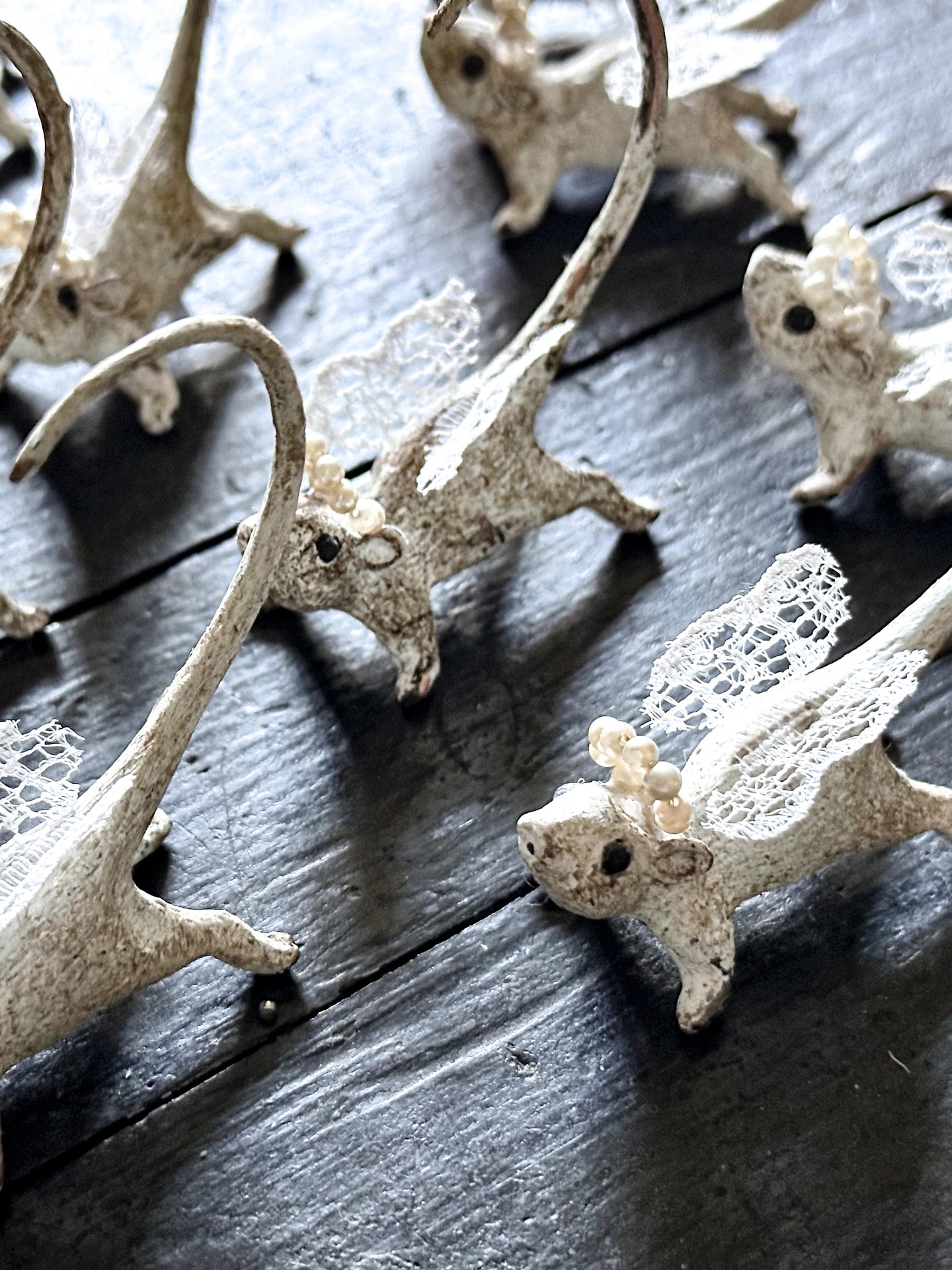 These beautiful heirloom keepsake mice are each hand cold painted, in either white and dressed in a hand wired vintage pearl halo and antique French lace wings.
