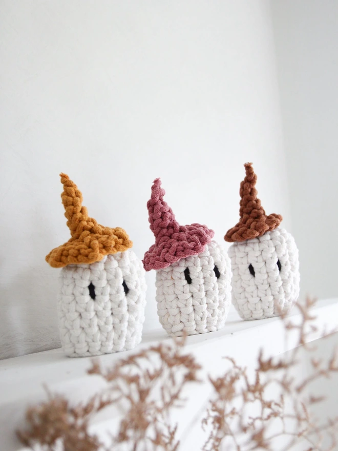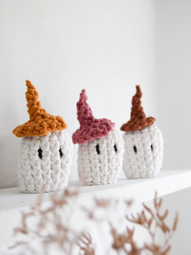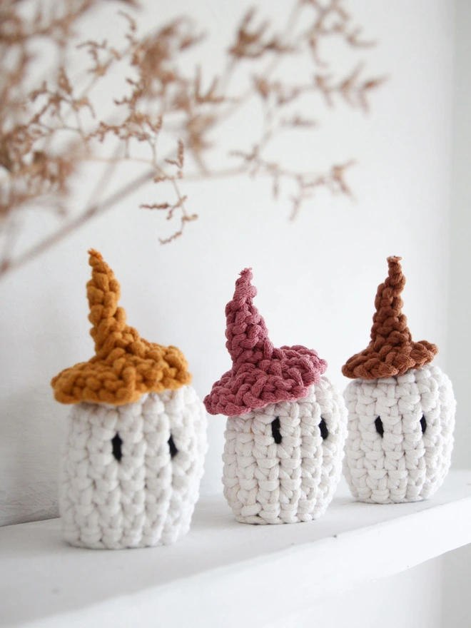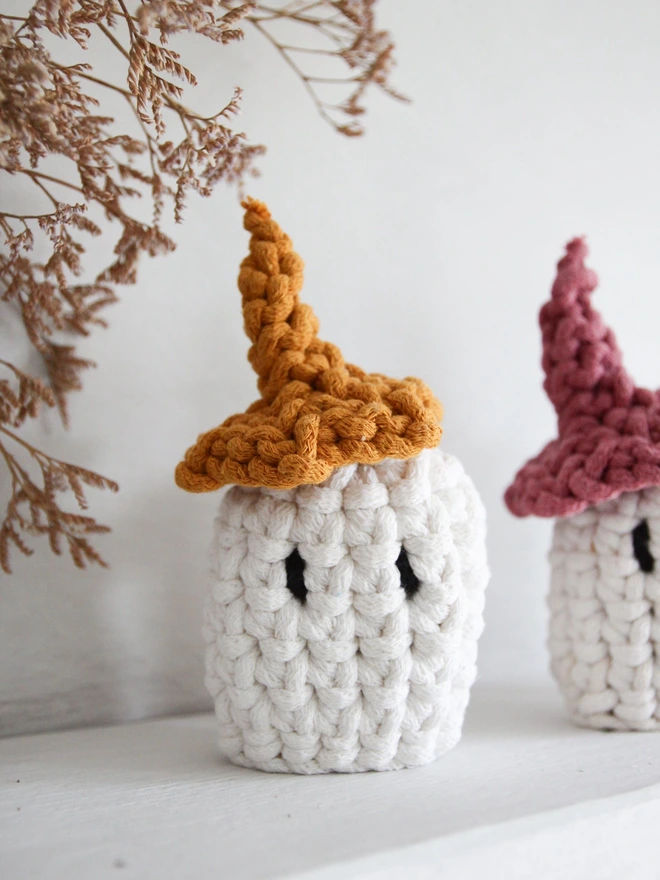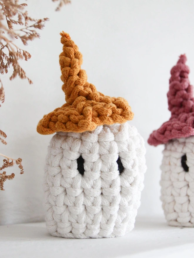 Bring a touch of handmade charm to your autumn decor with this friendly crochet ghost - the sweetest little companion for Halloween and cosy fall days. With its pointed hat and soft, chunky texture, it adds warmth, character, and a sprinkle of fun to any home.