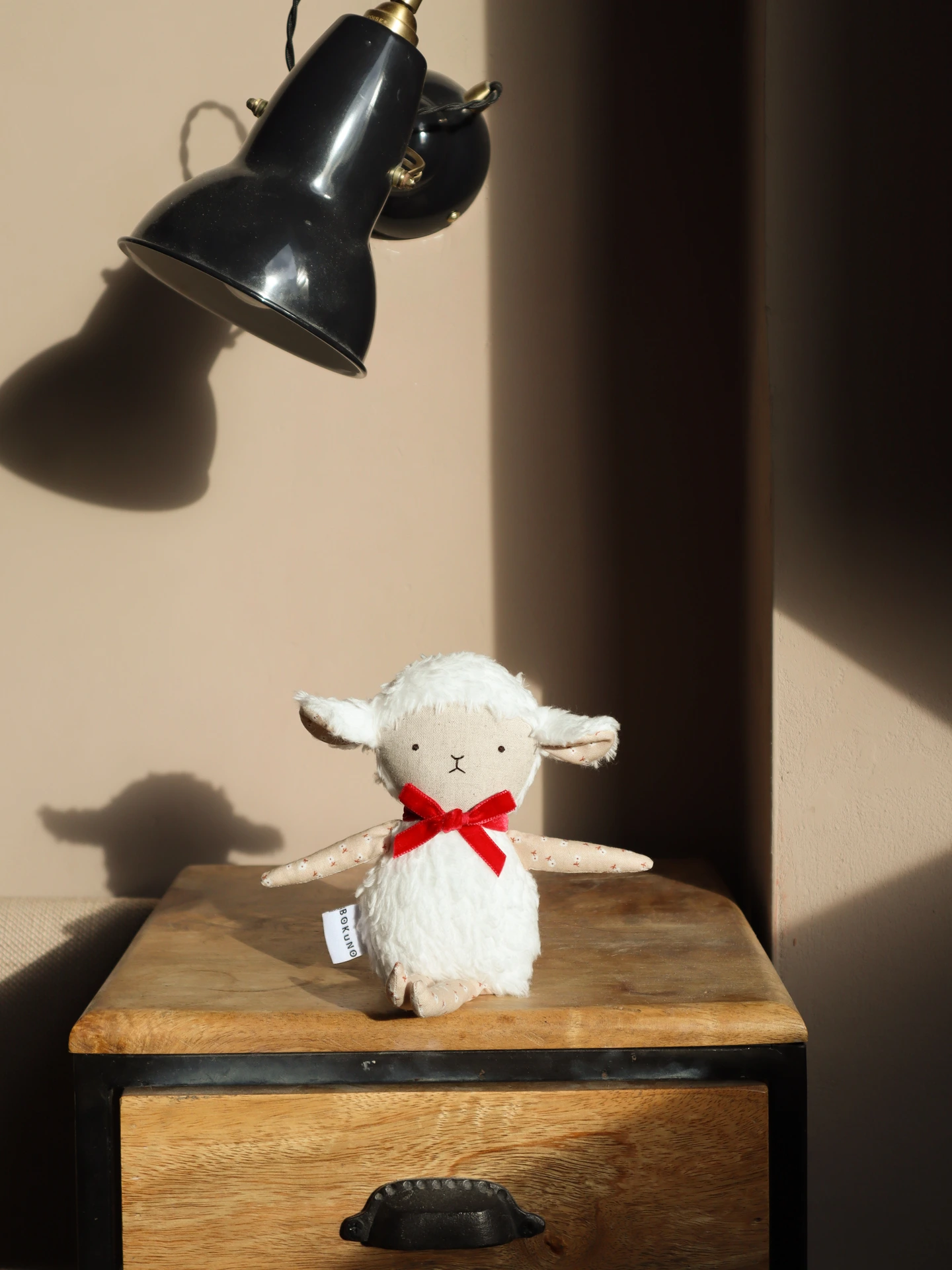A soft and gentle lamb, lovingly handcrafted for little hands and seasonal styling. Made with fluffy white fabric, delicate stitched features, and finished with a sweet red bow for a touch of warmth and charm.