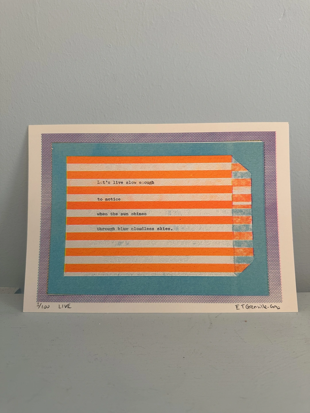 Soft, meditative hues and typewritten poetry combine to make a quiet companion for bedrooms, workspaces, or calm corners. As with all Sweet Nothings, each print shows the delicate textures and slight shifts that make risograph unique.
