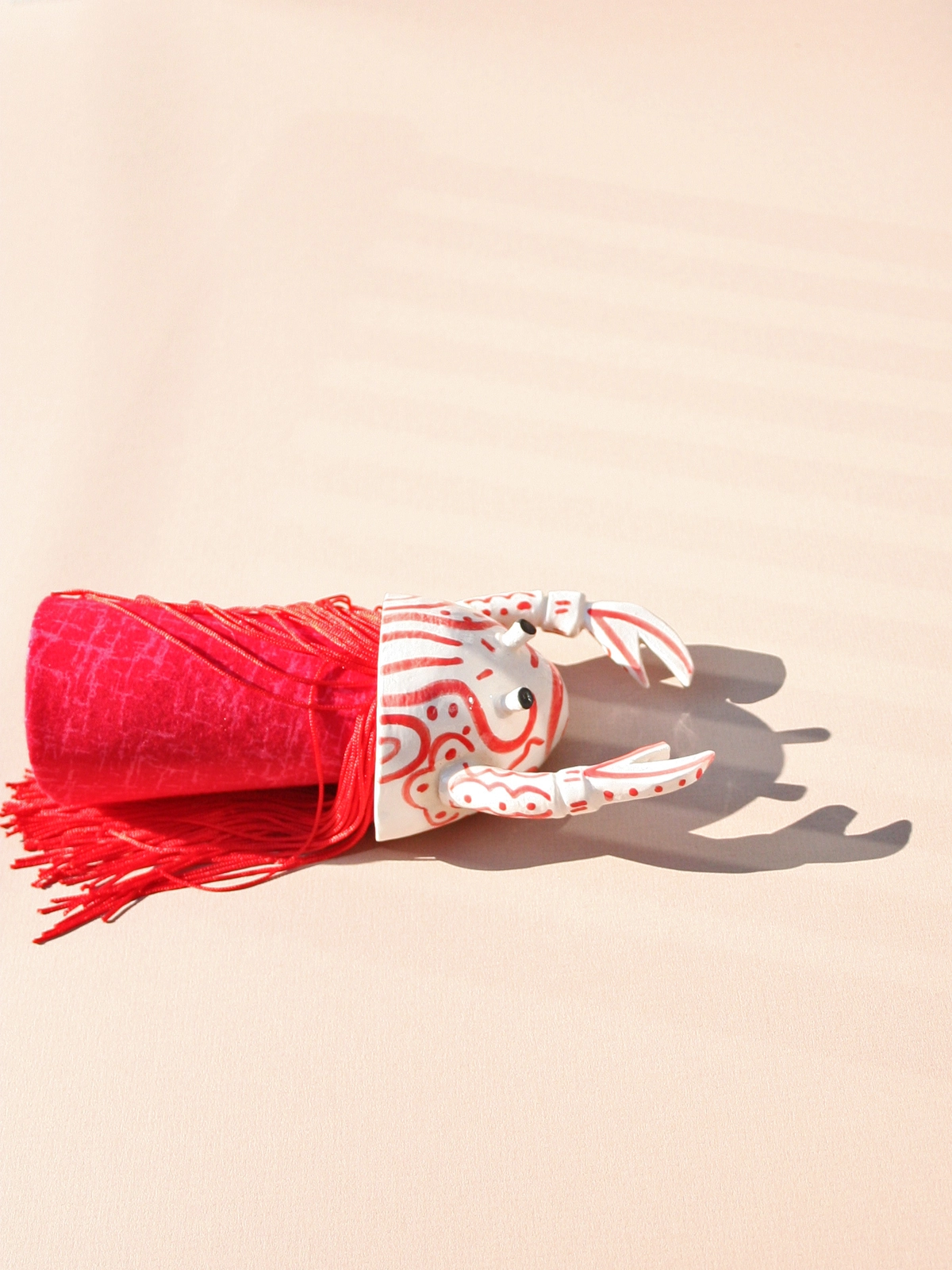Handmade Ceramic head and craws, made with Earthenware clay and decorated with slips and glaze. Card base covered with fabric and fringing overlay. there is a hole in the back of the head, to mount onto wall. A selection of handmade flags included.