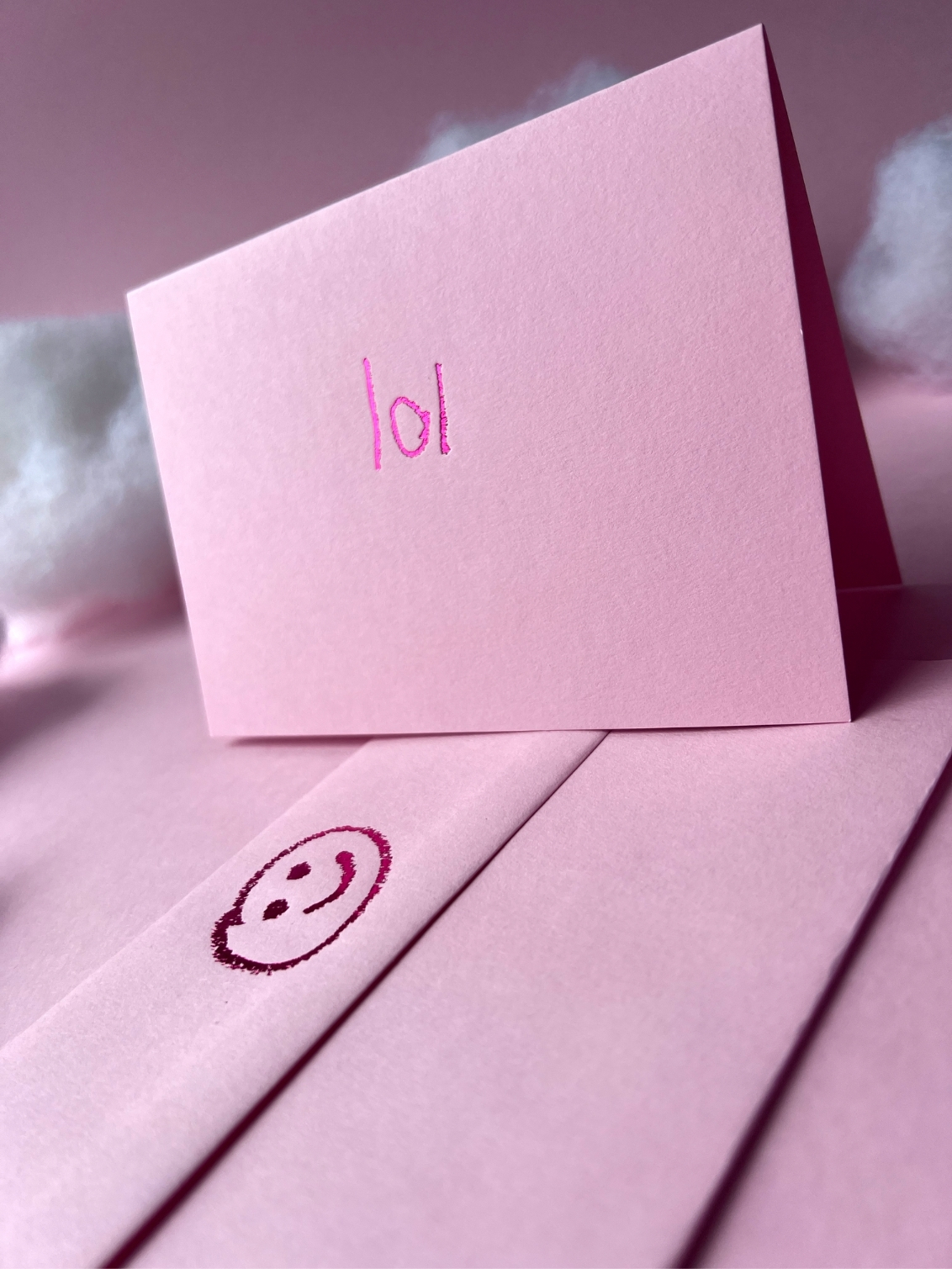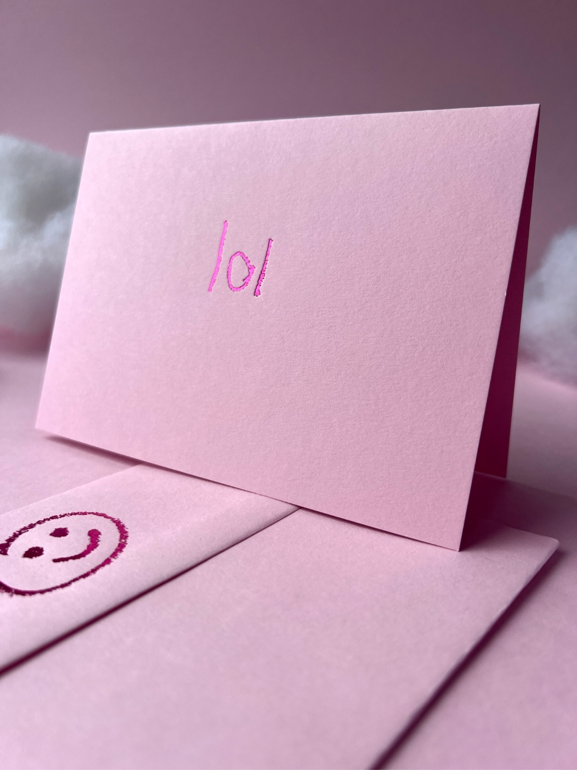 Nothing beats a proper lol. For inside jokes, awkward stories, or just to make someone grin, this is the card equivalent of sending your mate a laughing text. Foiled on candy pink coloured paper with a shiny finish, plus a smiley envelope to seal it with a giggle.