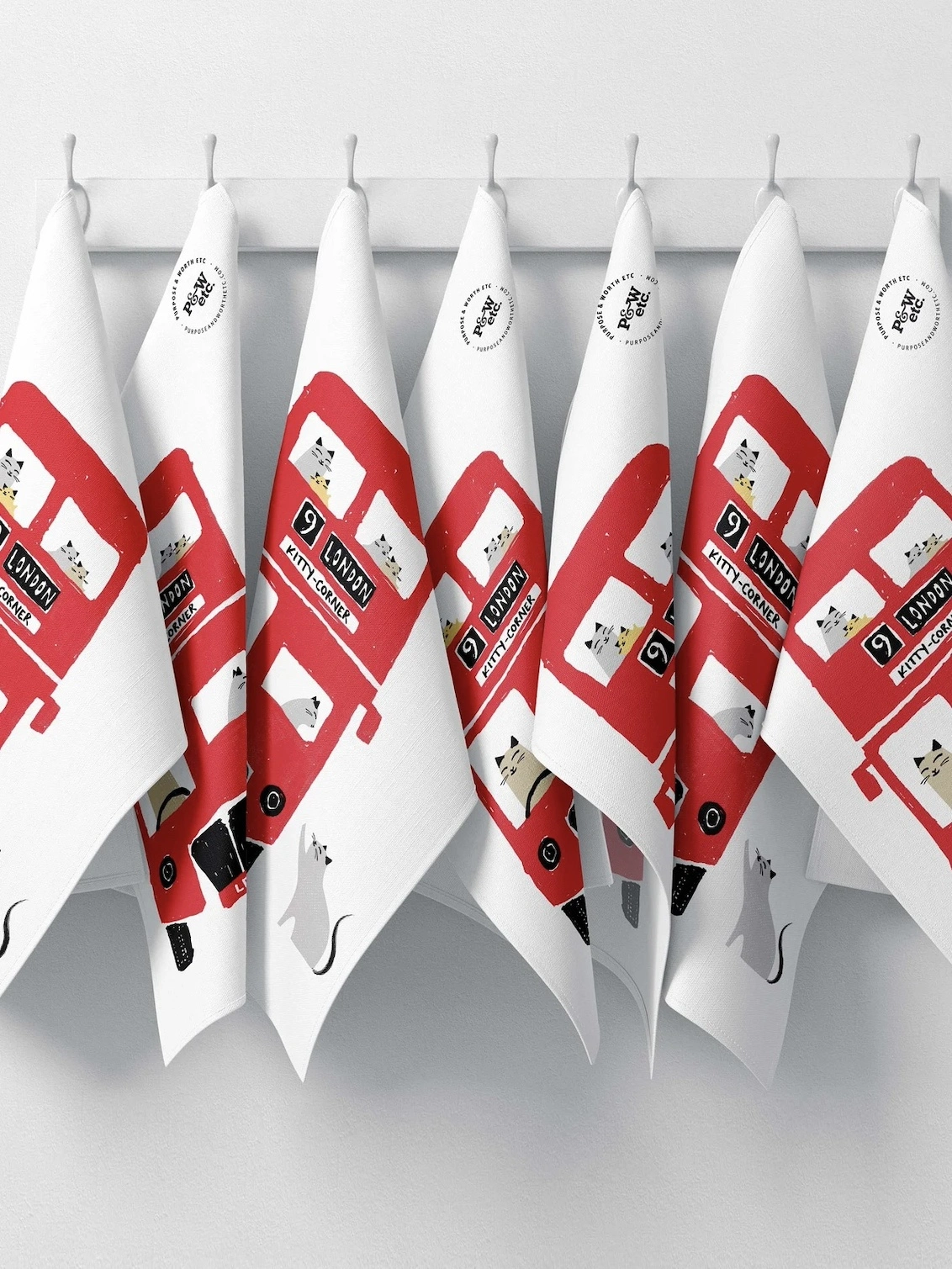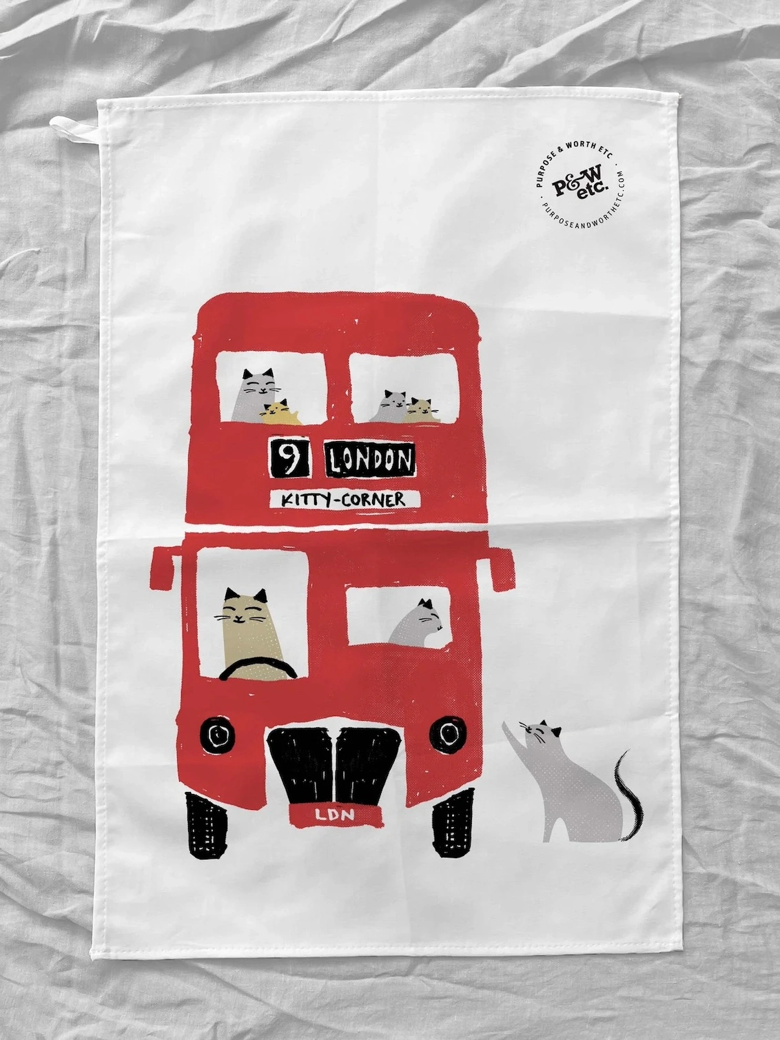 All aboard! Take home a piece of England with this adorable London Bus tea towel for cat lovers.