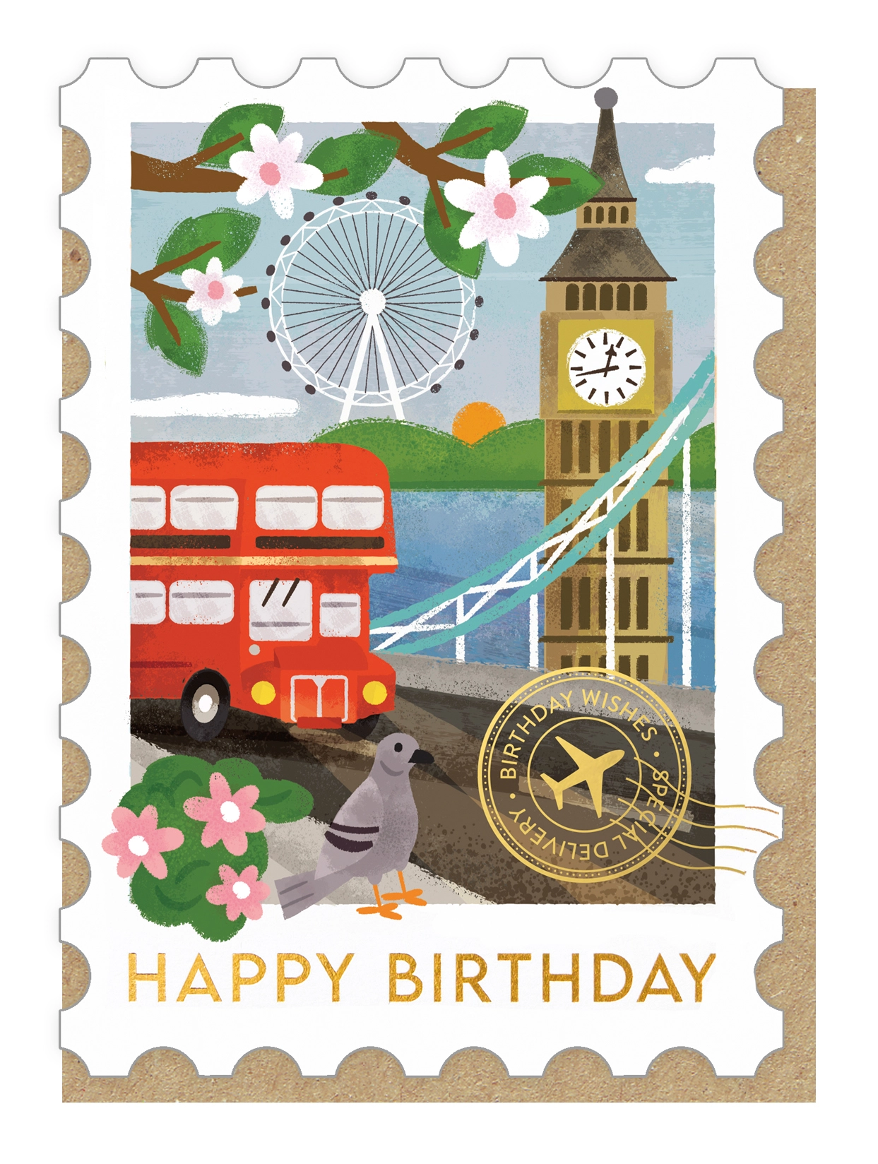 This travel-themed design is sure to trigger a serious case of wanderlust. From the Rockies to Santorini, each design features a much-lusted-after travel destination illustrated beautifully, die-cut into a stamp shape and finished with a gold foiled postmark and birthday message.