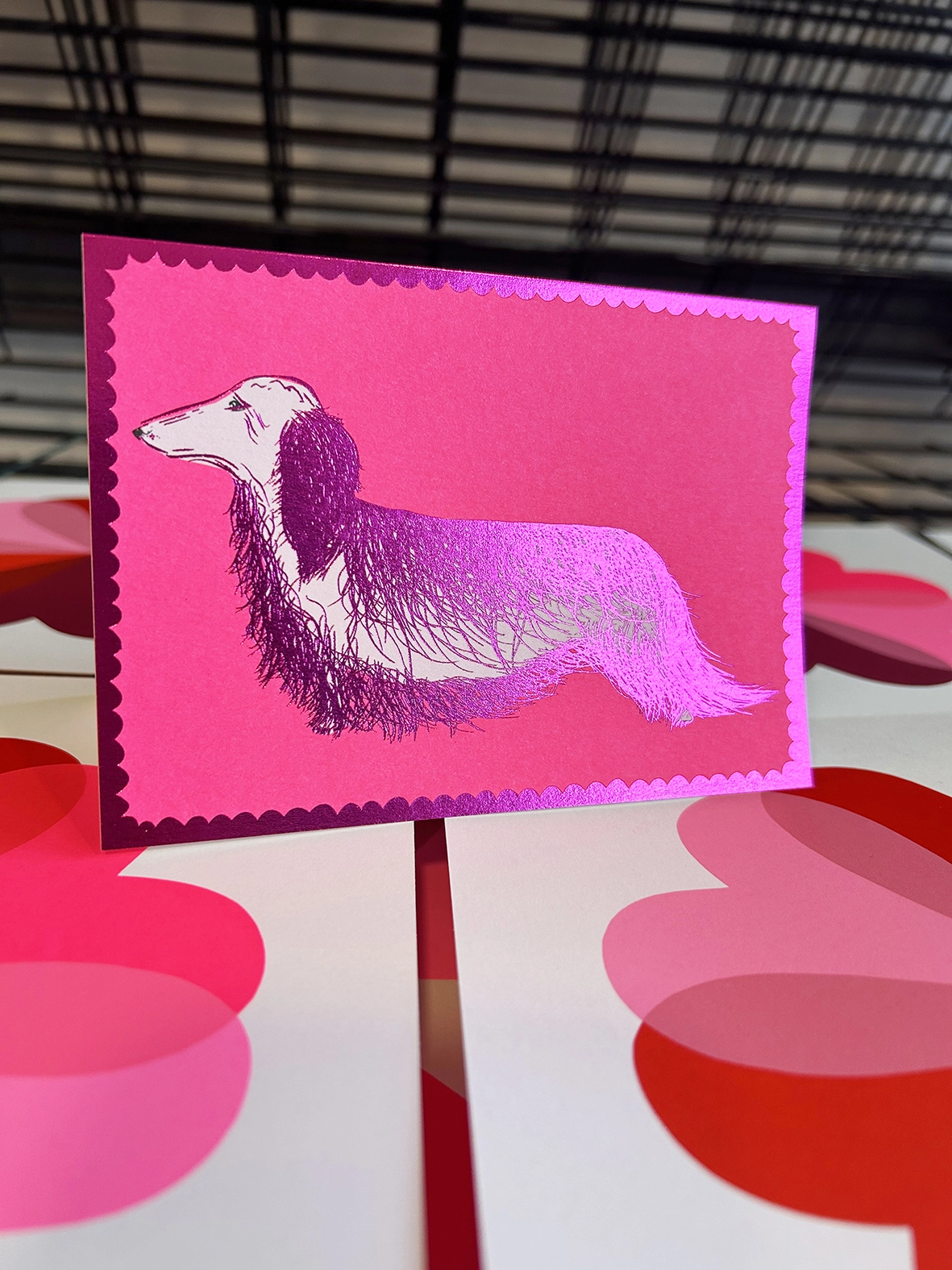 Gold or Neon Pink Foiled Hairy Sausage Dog with a Scalloped edge, I adore this NEW card!