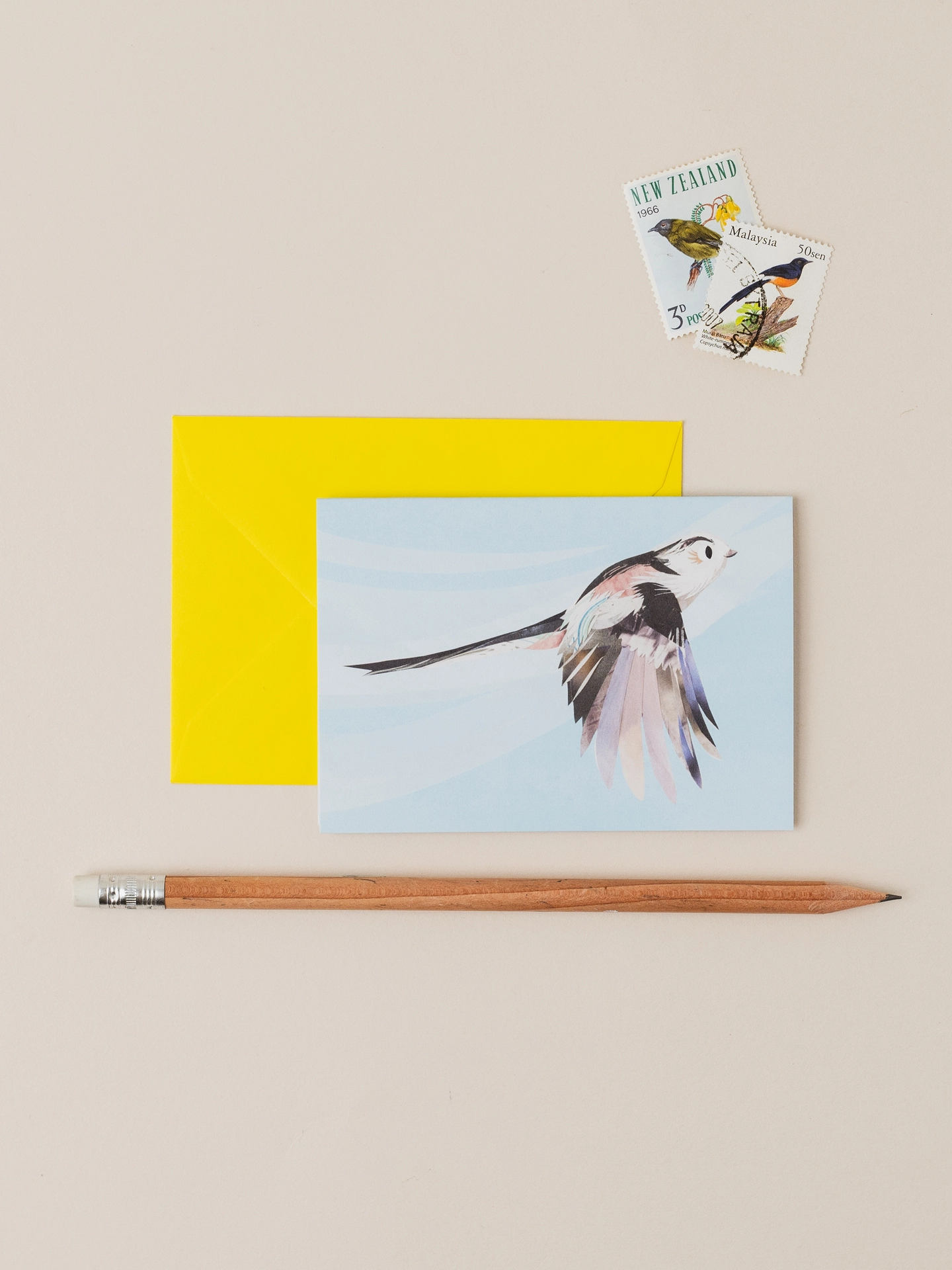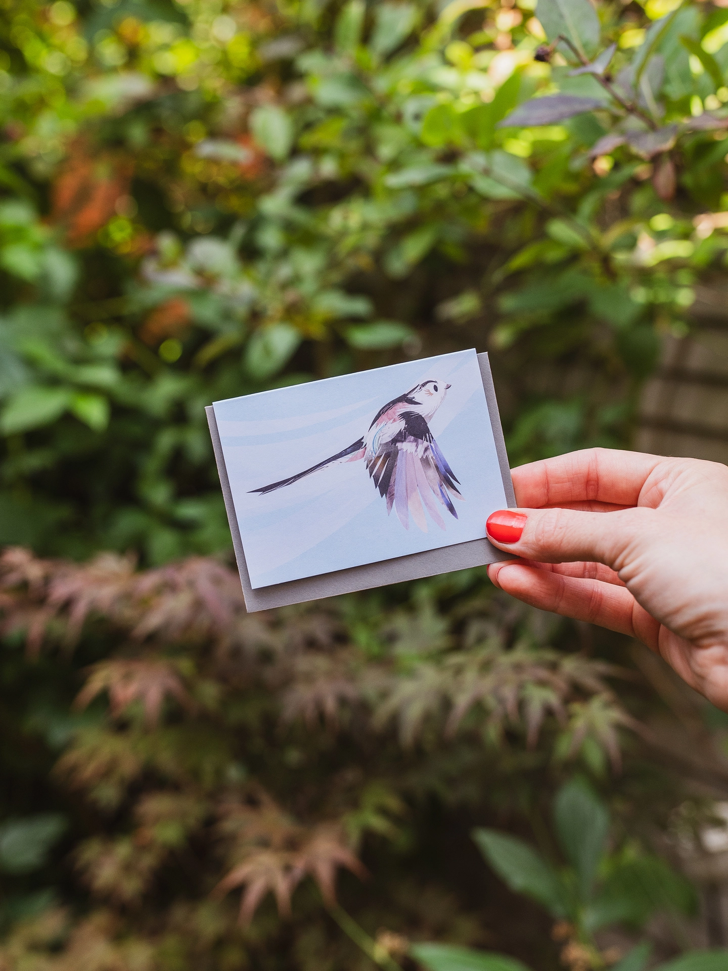 Share a touch of countryside charm with this mini card featuring a long-tailed tit in flight. The original artwork was lovingly created by Kate Slater, using her signature mixed media collage technique.