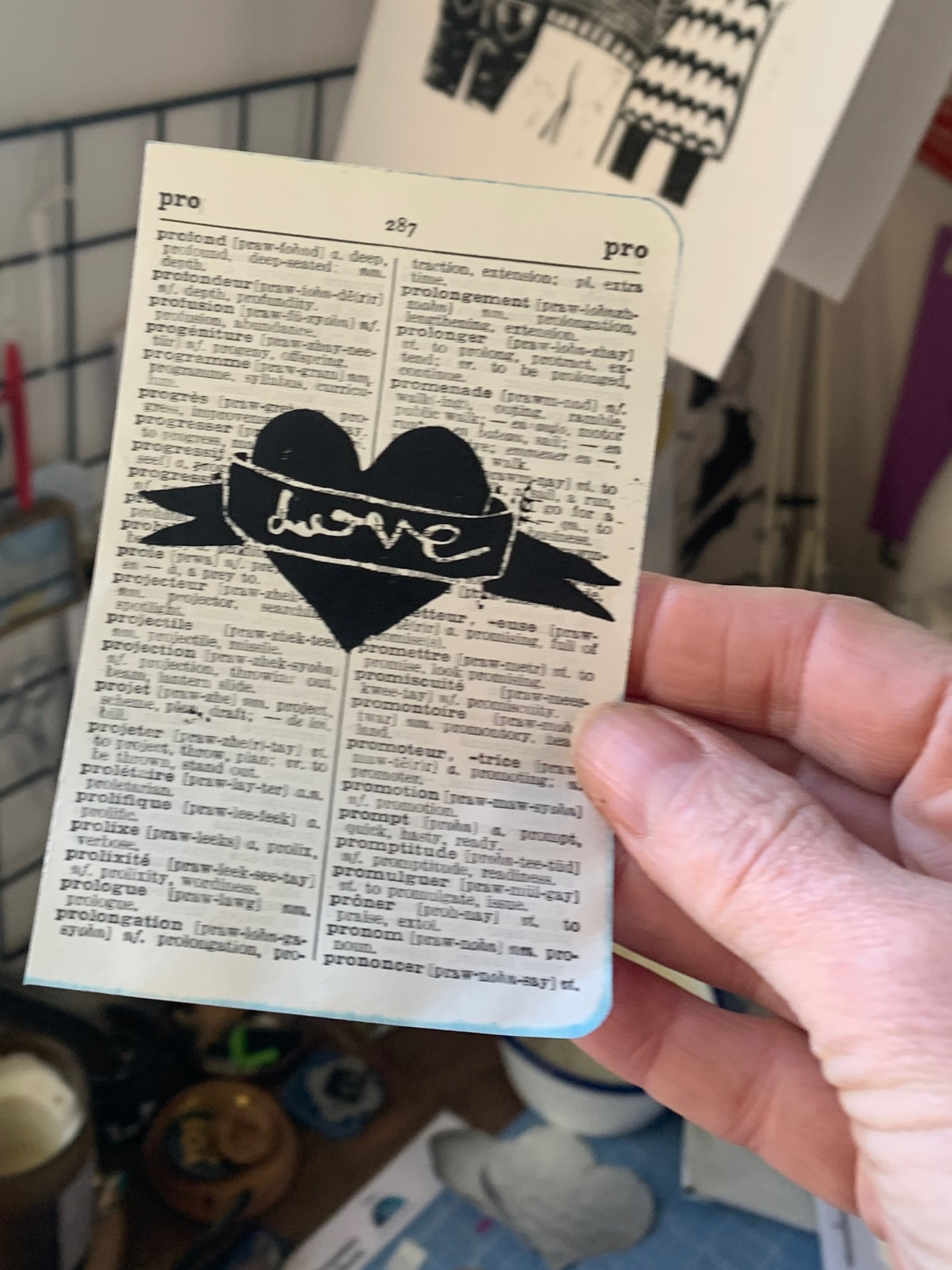 LOVE Heart // Linocut Mini Print // printed onto Vintage French Dictionary Pages