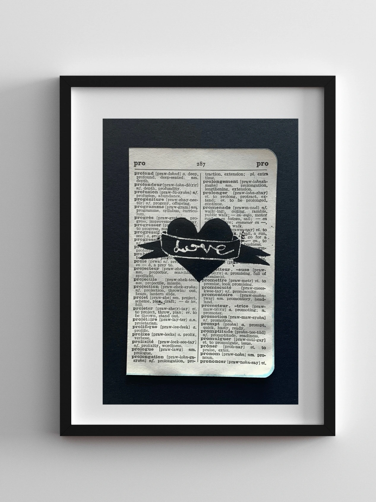 This print has been created from by hand carving natural linoleum, and then handprinted using eco-friendly professional printing inks onto vintage French dictionary pages.