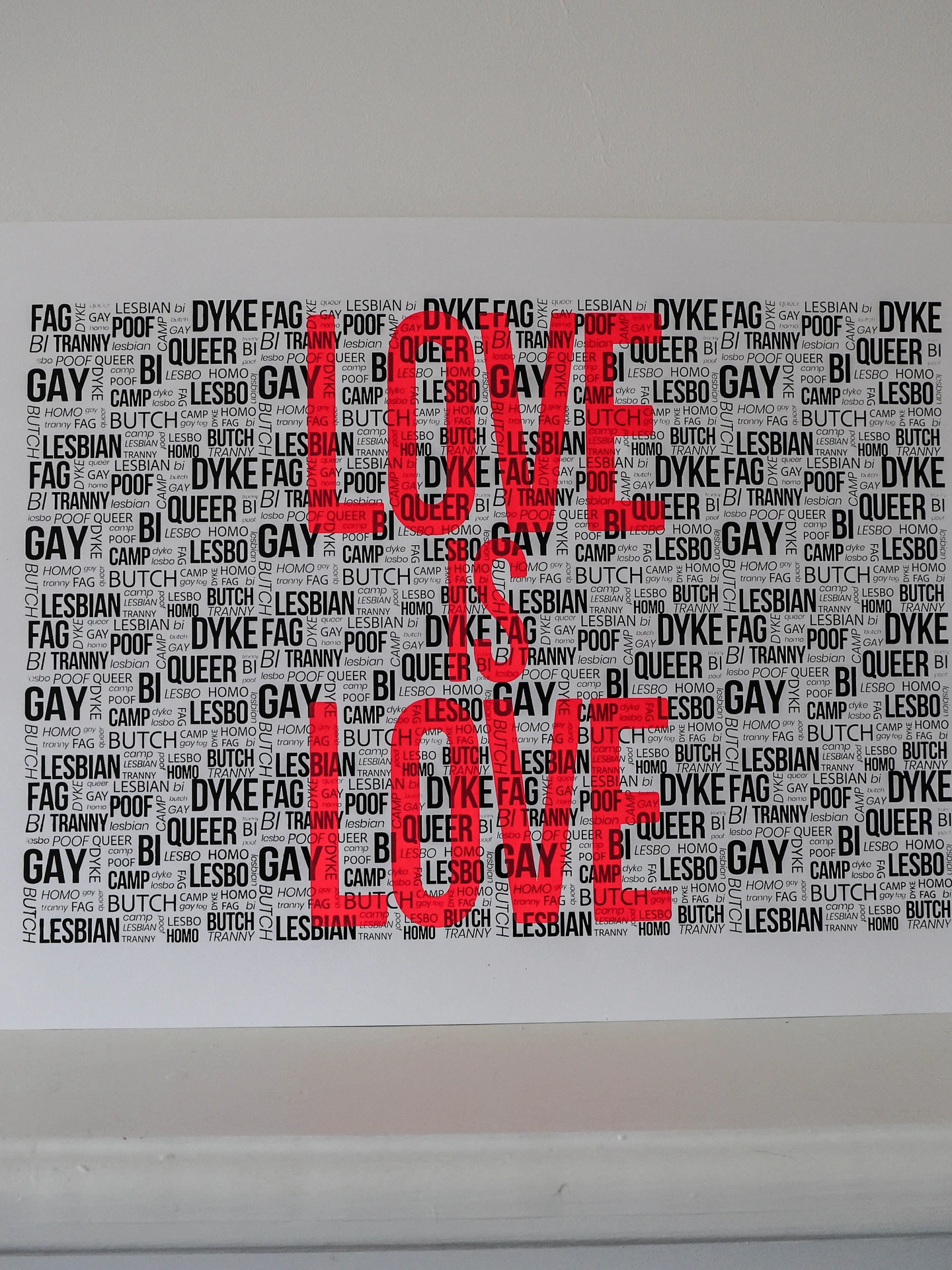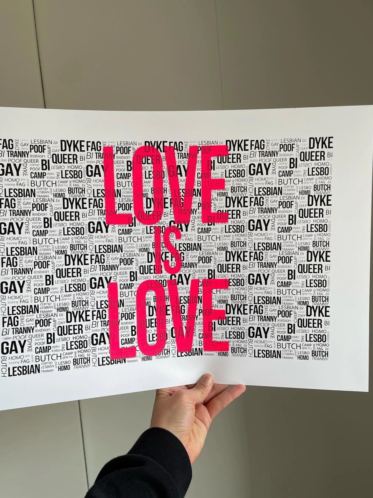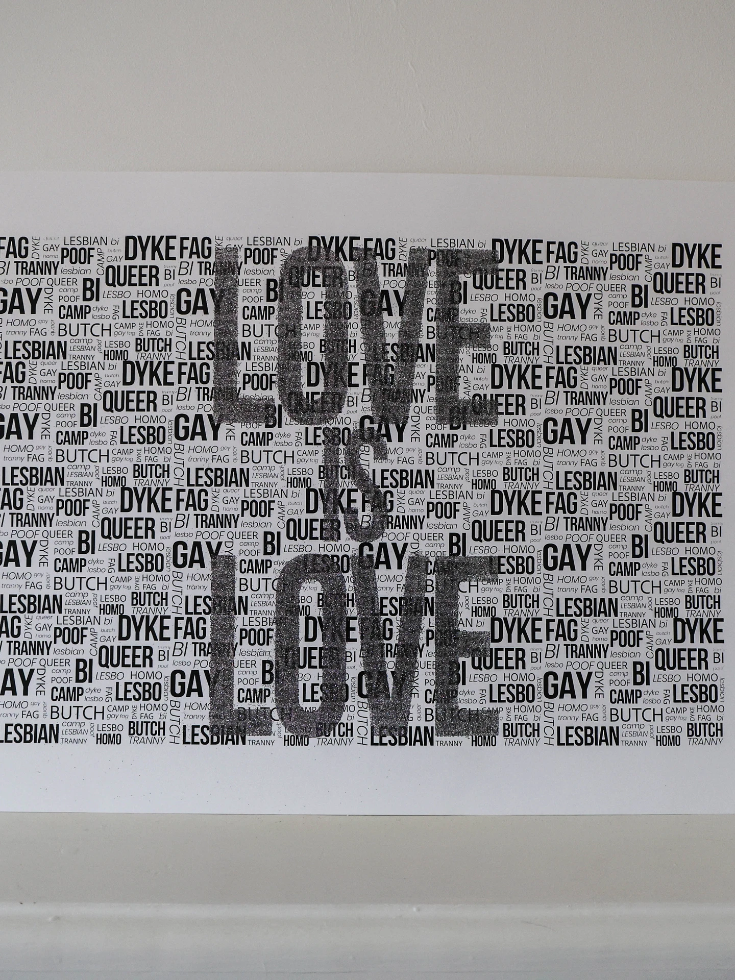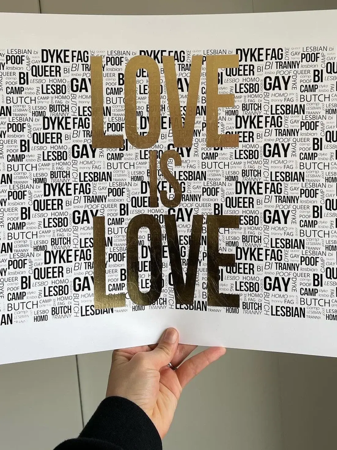 This is a special piece from Watford based screen print artist, Abby Blanshard. This print reclaims the homophobic slurs used against the LGBTQIA+ community. Choose between hand applied Gold Leaf, Neon Pink and holographic rainbow glitter.