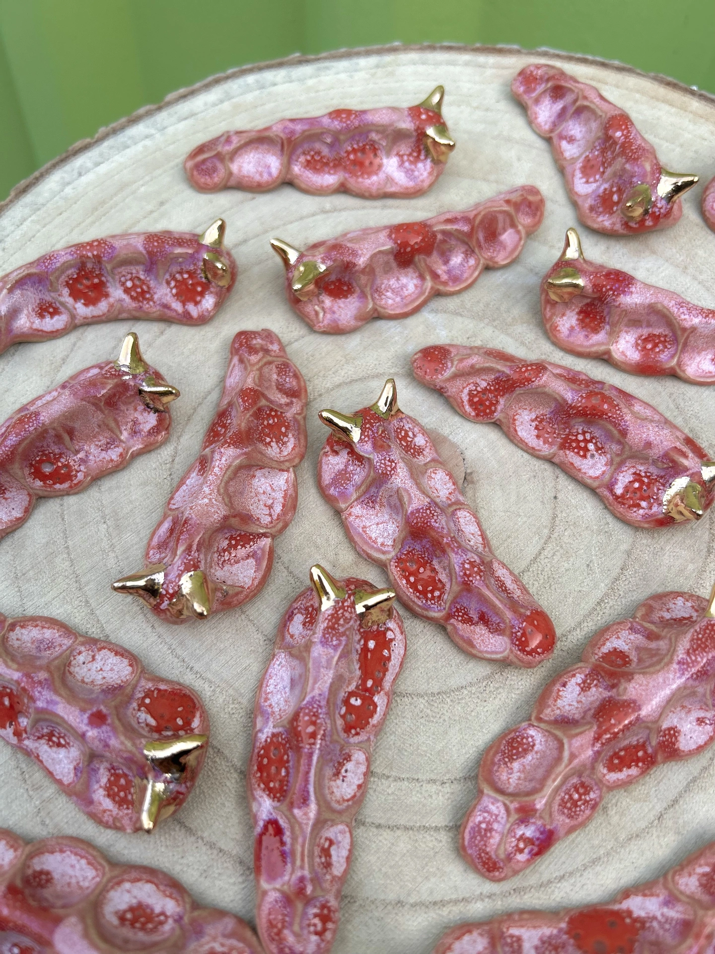 Carefully sculpted with lifelike details and a smooth, pink glaze and gold accents, each slug is one of a kind.