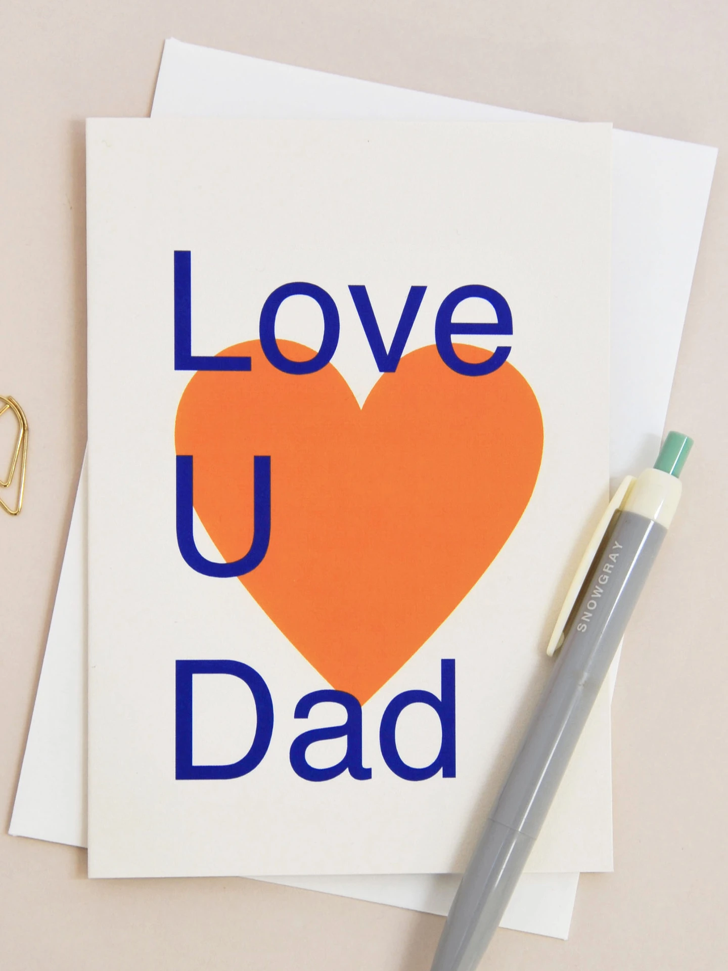 A bold and modern Father’s Day card featuring a large heart with a playful “Love U Dad” message.