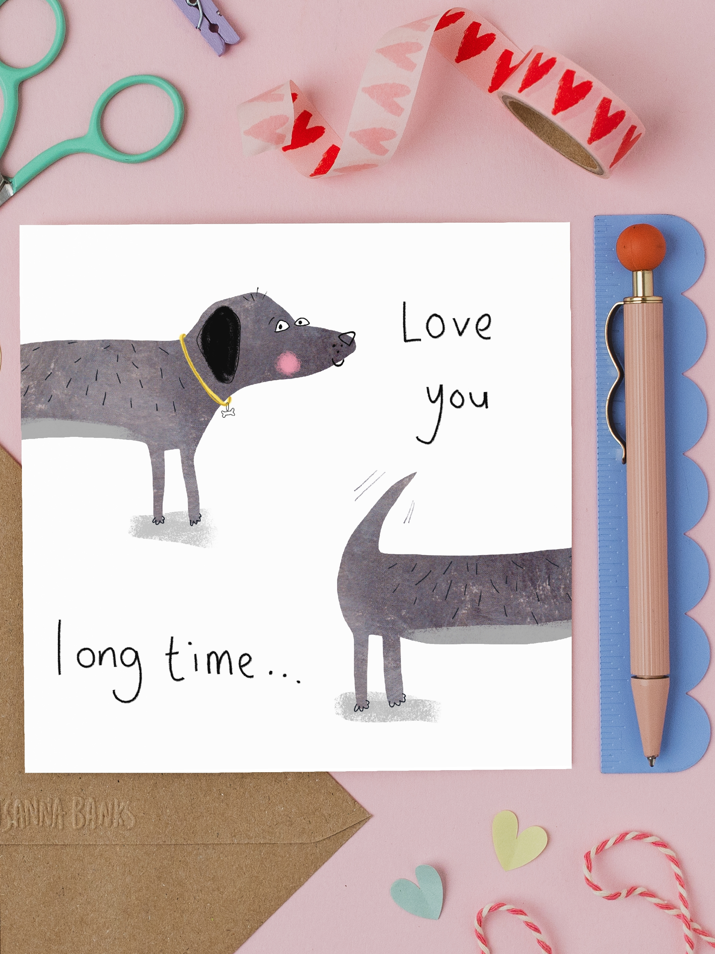 Express your love the fun way with this 'Love you longtime' sausage dog! And then wrap yourself around your love just like this dog has himself wrapped around your card!