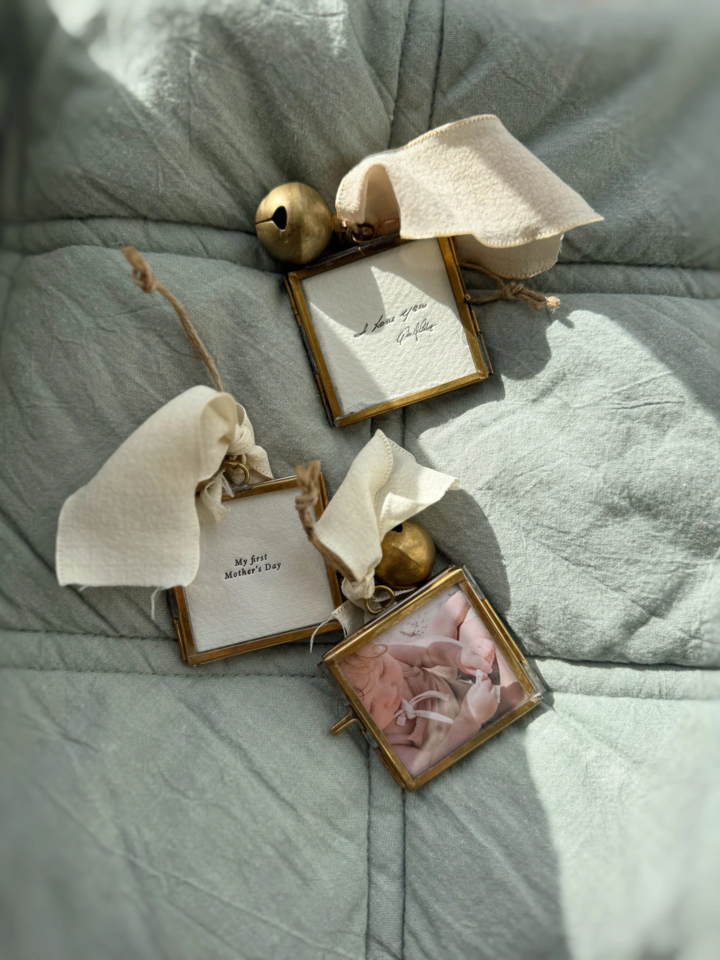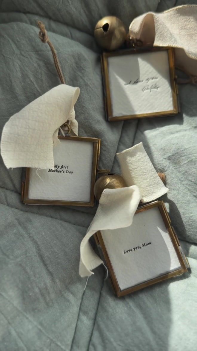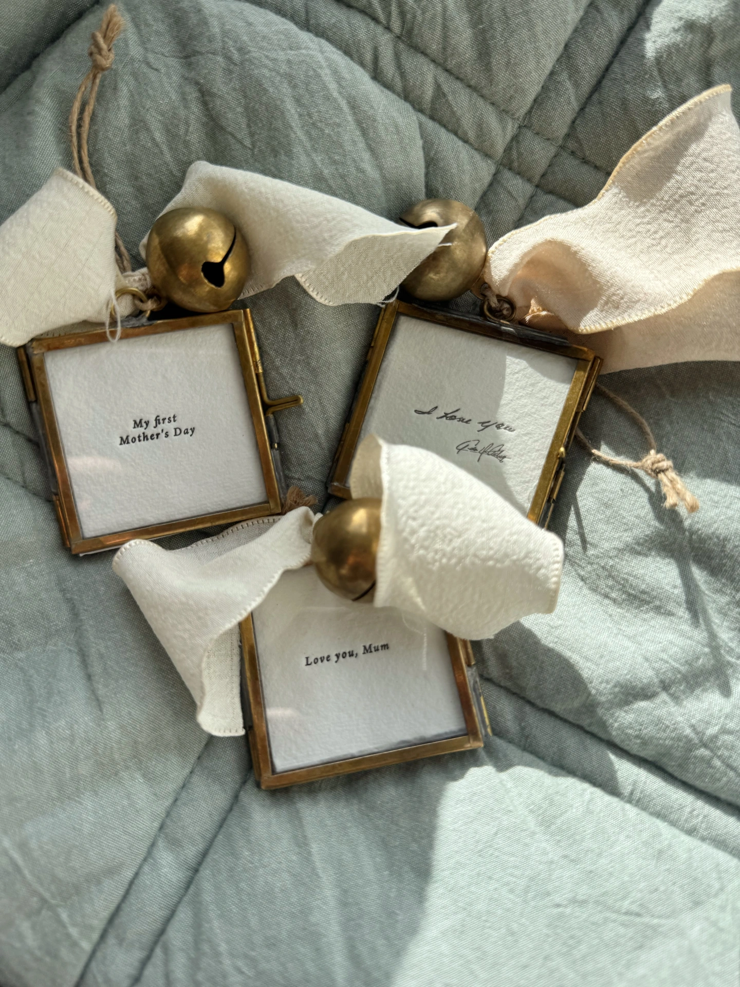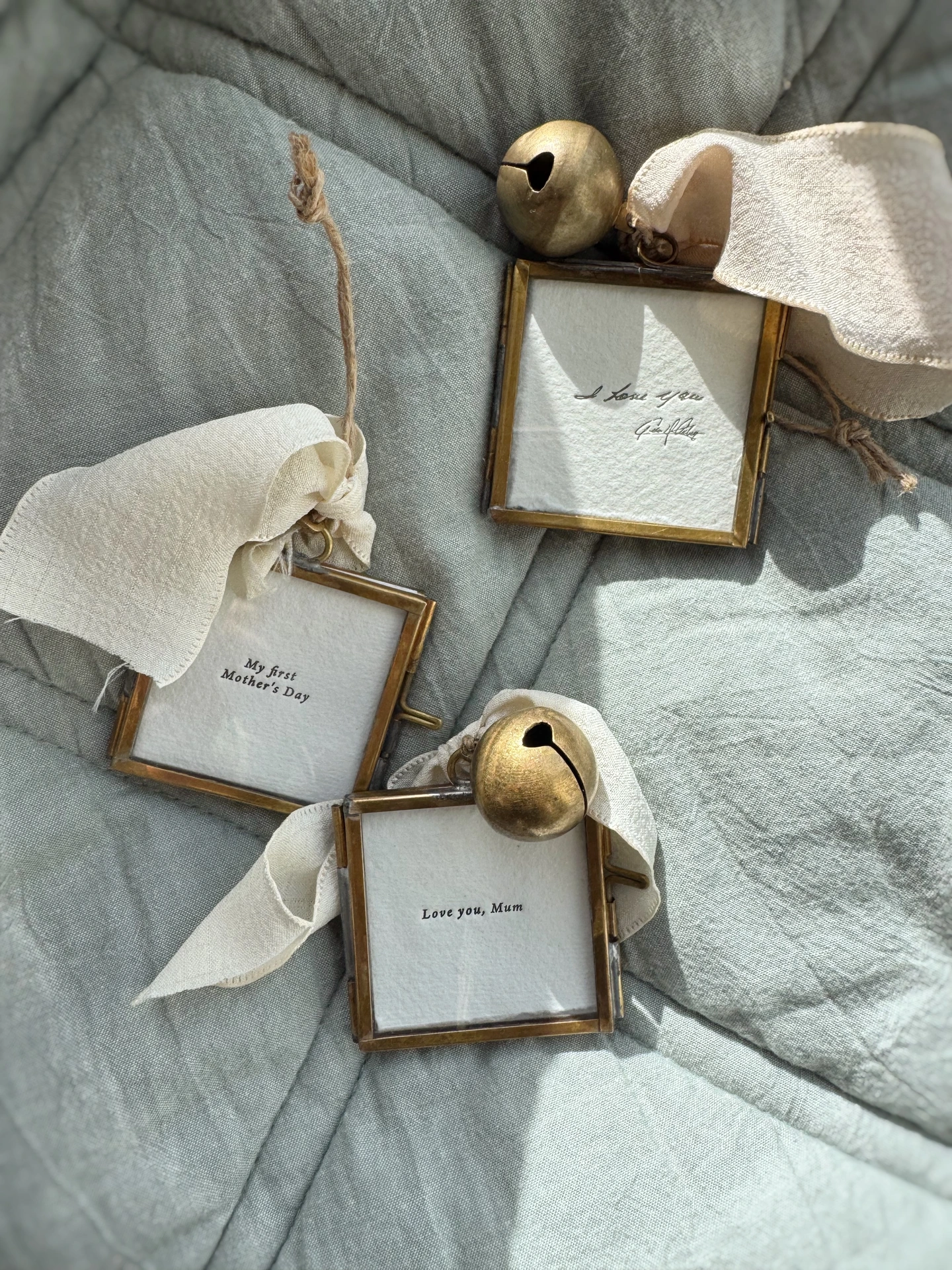 These mini hanging frames can be used as interior decoration around the house, to be enjoyed in everyday life or hung on a Christmas tree. The letterpress work on the inside of the frame is printed on handmade paper in house on our antique letterpress here in Wales. Each mini fame measures to 2 by 2 in. The frame can be opened so that you can place your own photo inside!