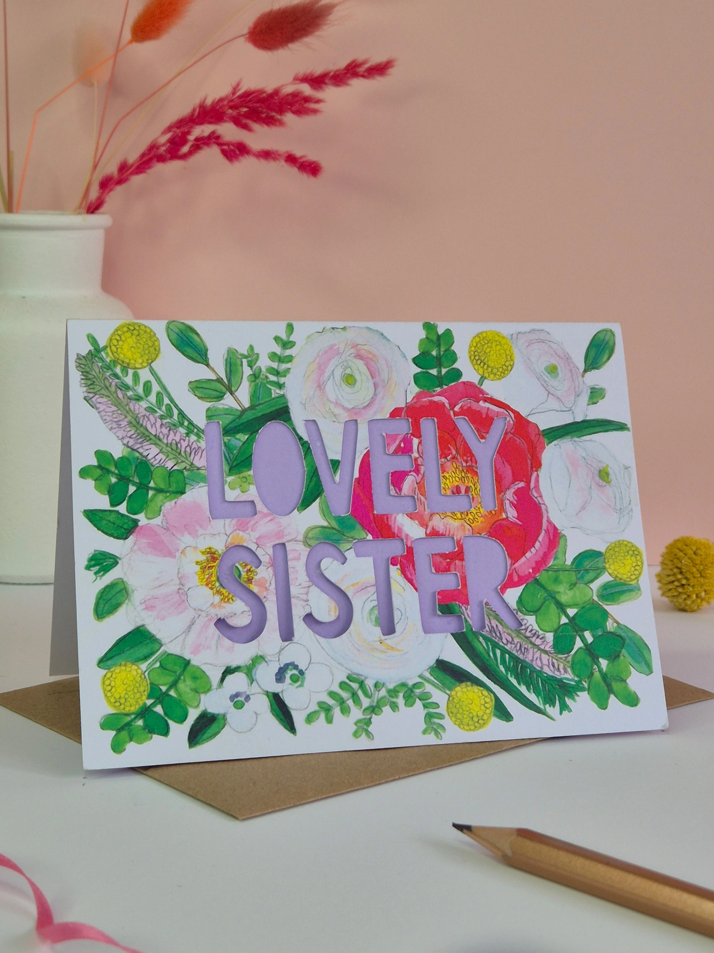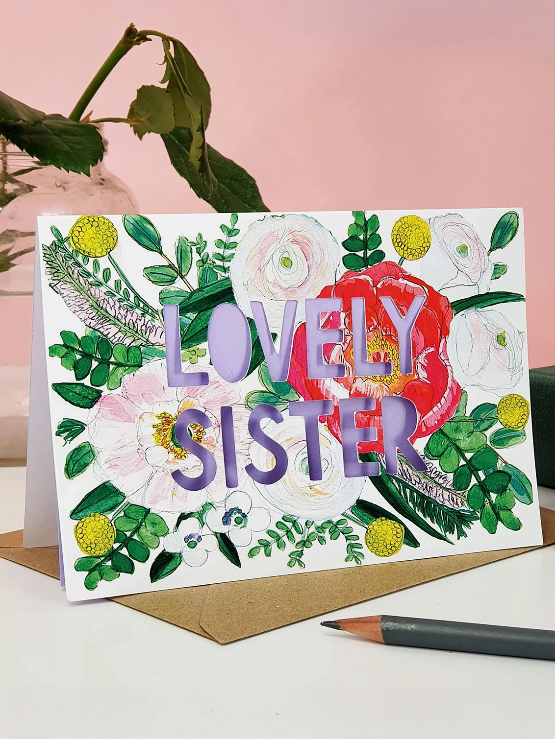 Coupled with my bright watercolour florals, this white based card, is customised with a 'Lovely Sister' cut out in paper cut letters and backed with a coloured liner.