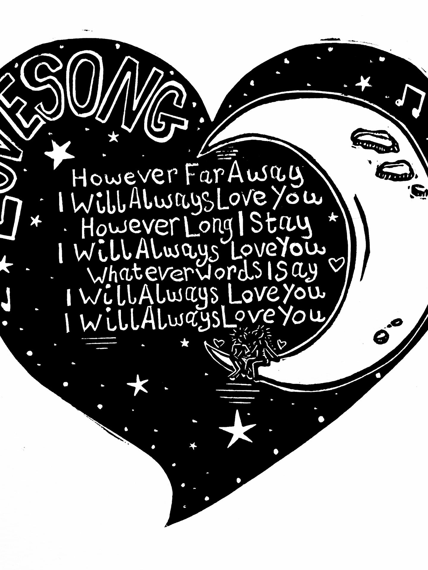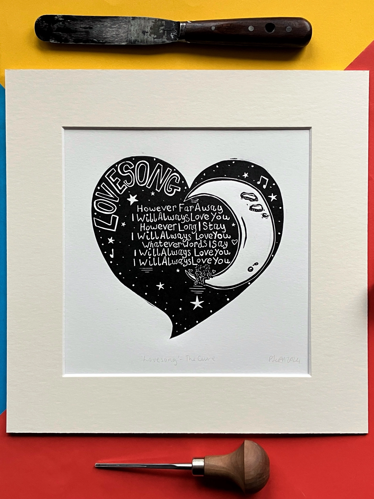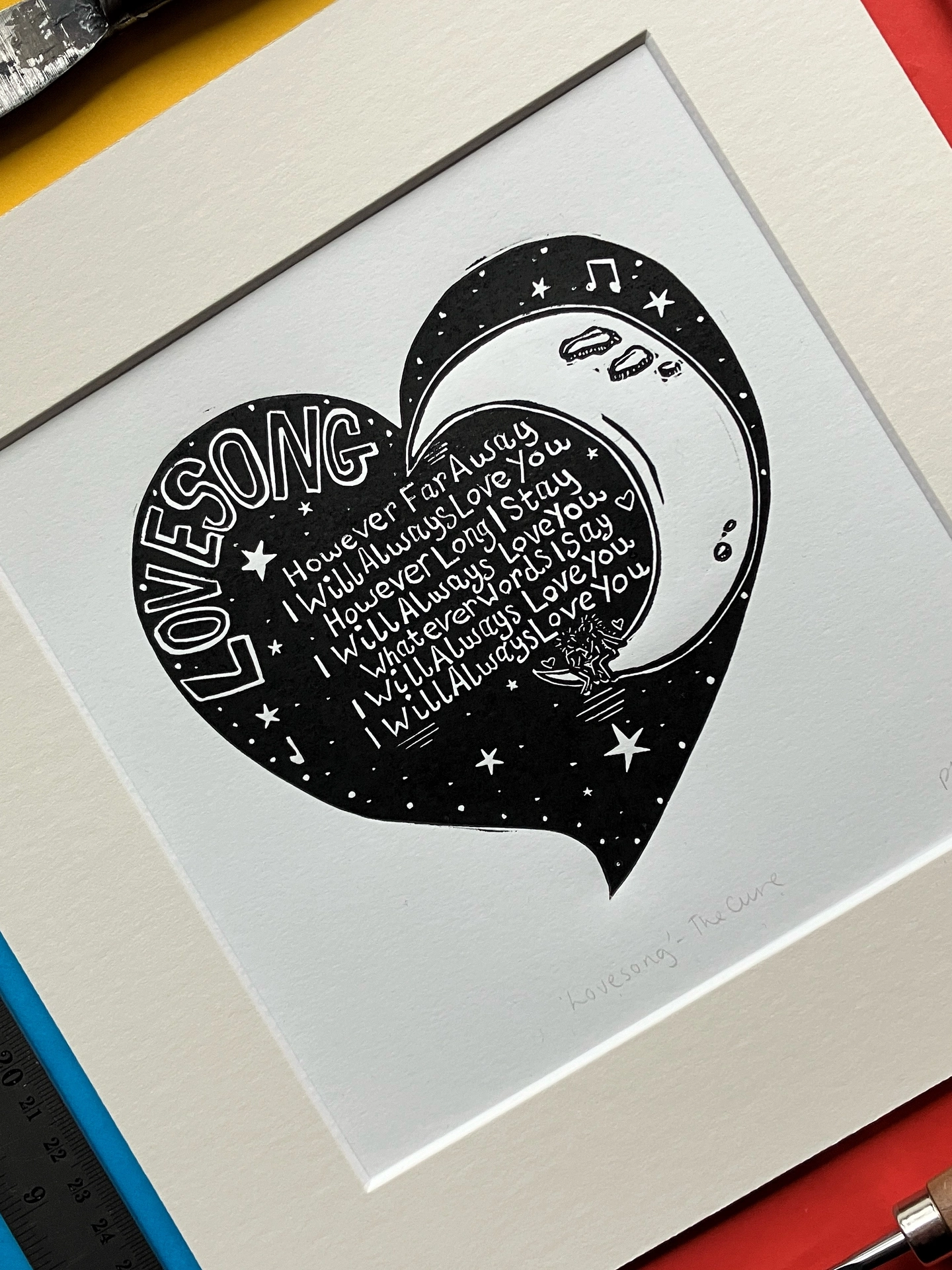 Original linocut print inspired by the song 'Lovesong' by The Cure from the album Disintegration