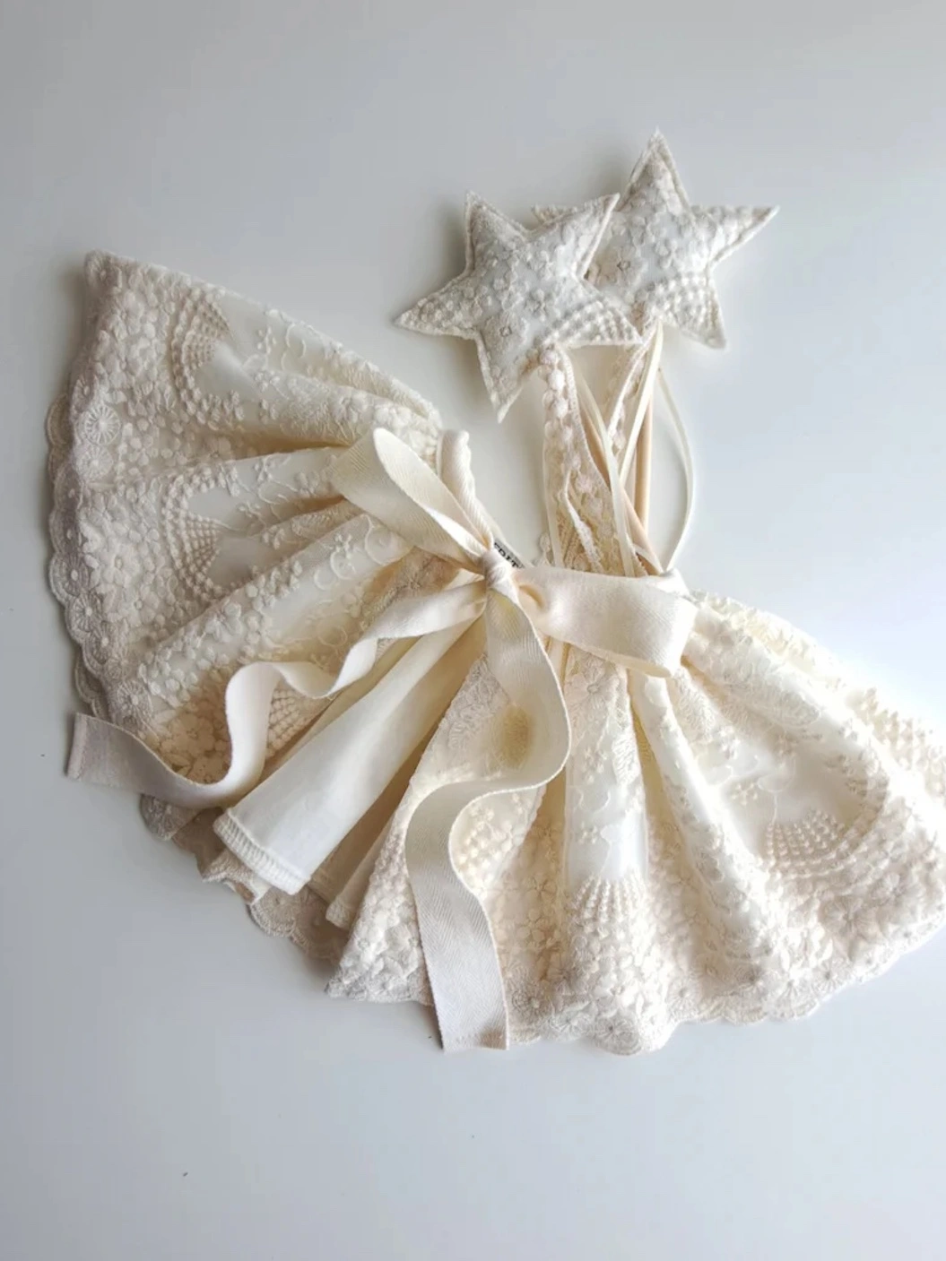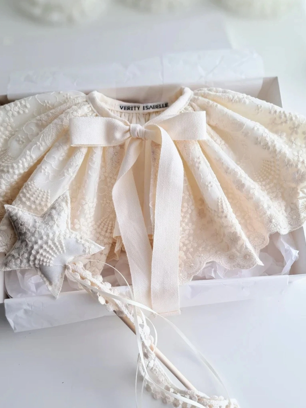 Each piece, including the cape and party hat, is sold individually, allowing you to curate the perfect combination for your little one's special moments. A delicate, heirloom-style celebration collection for little ones with big imaginations. Handmade in creamy cotton and embroidered lace, the Lucine set includes a vintage-inspired cape, soft ruffled party hat, and a star wand with fluttering satin and lace streamers.