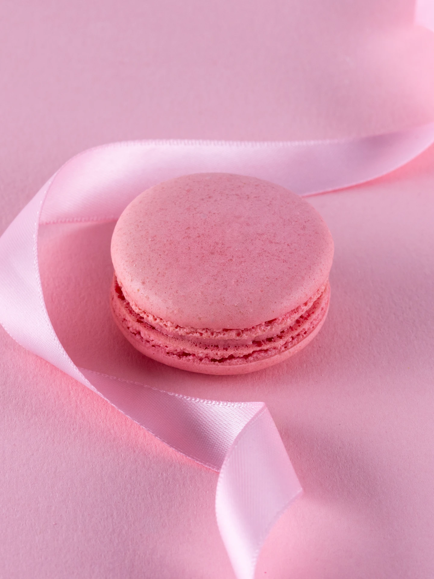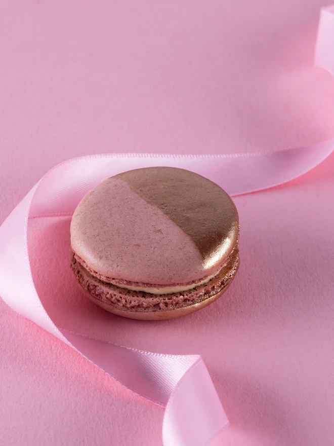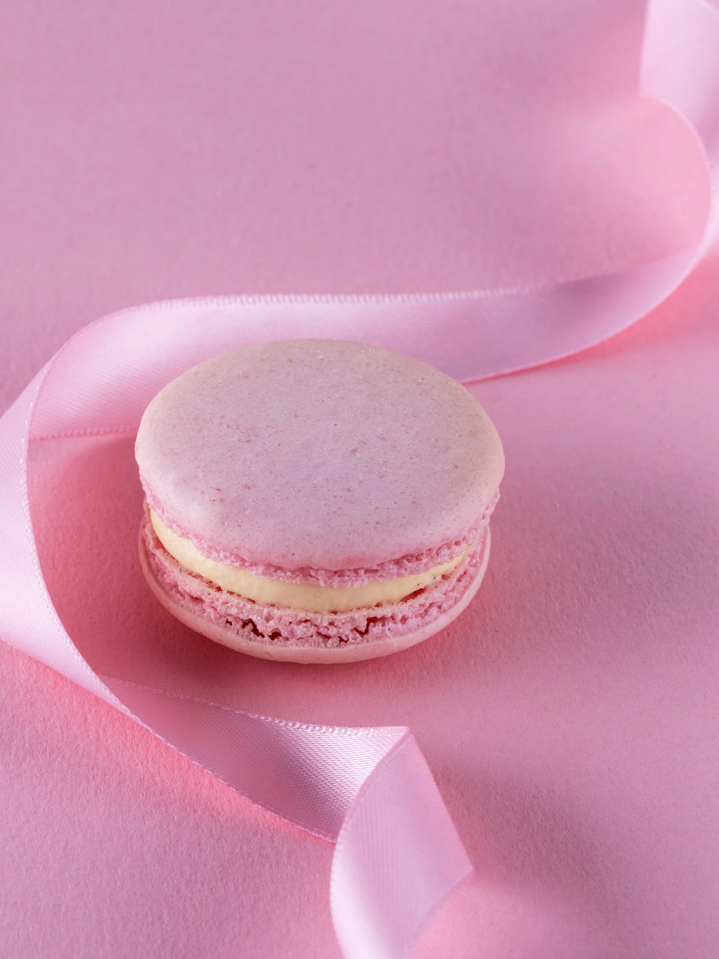 Strawberry and Pink Peppercorn: Granulated sugar, icing sugar, ground ALMONDS, EGG WHITES, unsalted BUTTER (MILK), strawberry puree (strawberry 100%), water, freeze dried strawberry powder, pink peppercorn, sea salt; humectant: vegetable glycerine E422; colour carrier: mono propylene glycol E1520; thickener: silicon dioxide E551; colours: carmoisine E122*, allura red E129*, brilliant blue FCF E133, calcium carbonate E170i. Decoration: White chocolate (28.1% cocoa solids, contains SOYA, MILK),