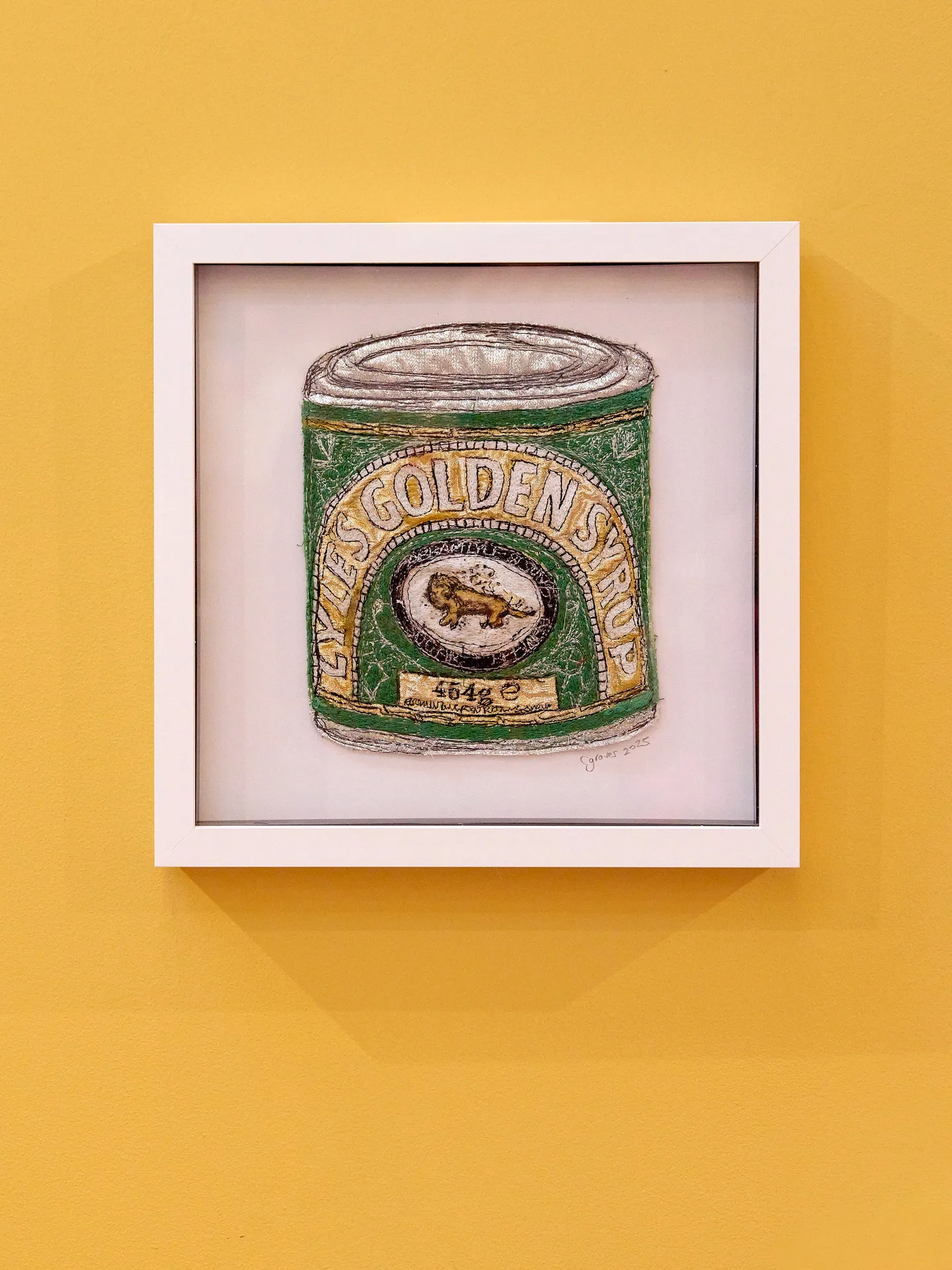 This piece celebrates the classic Lyle’s Golden Syrup design, lovingly made using gold lamé fabric appliqué, free-motion embroidery, and hand-painted details — all created on recycled vintage linens.