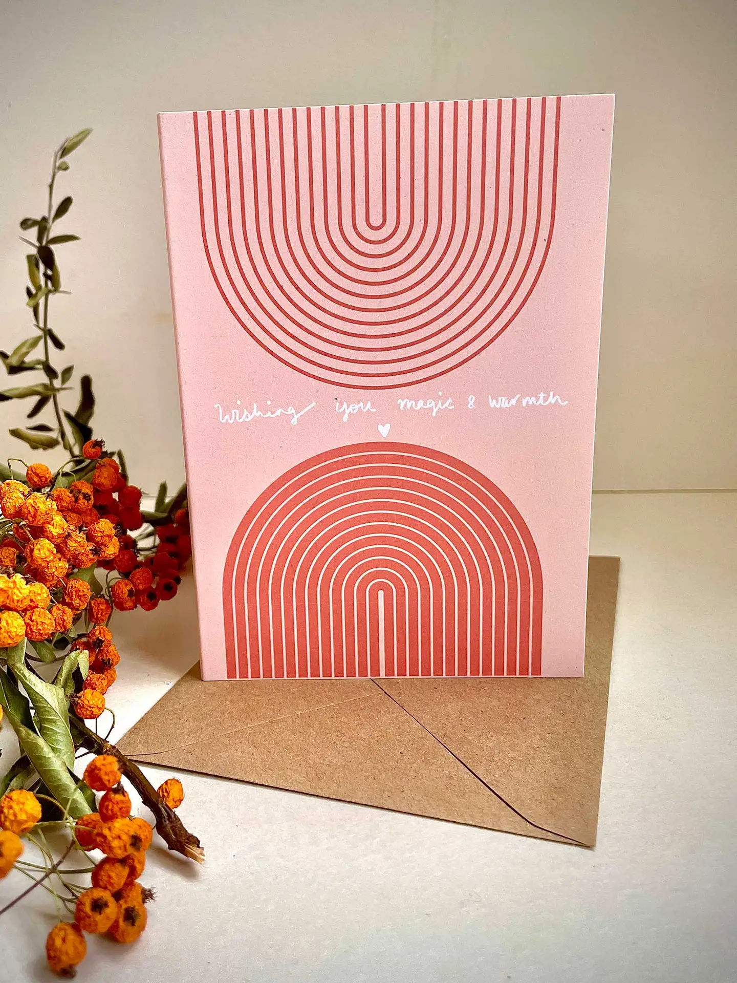 Standard A6 size greeting card designed by Nicola Rowlands and printed in the UK. Proudly printed on recycled card. Will be mailed to you in a hardback envelope and will include a brown recycled paper envelope. Card is blank inside for your own message. Cello bags made from cornstarch and are compostable and biodegradable.
