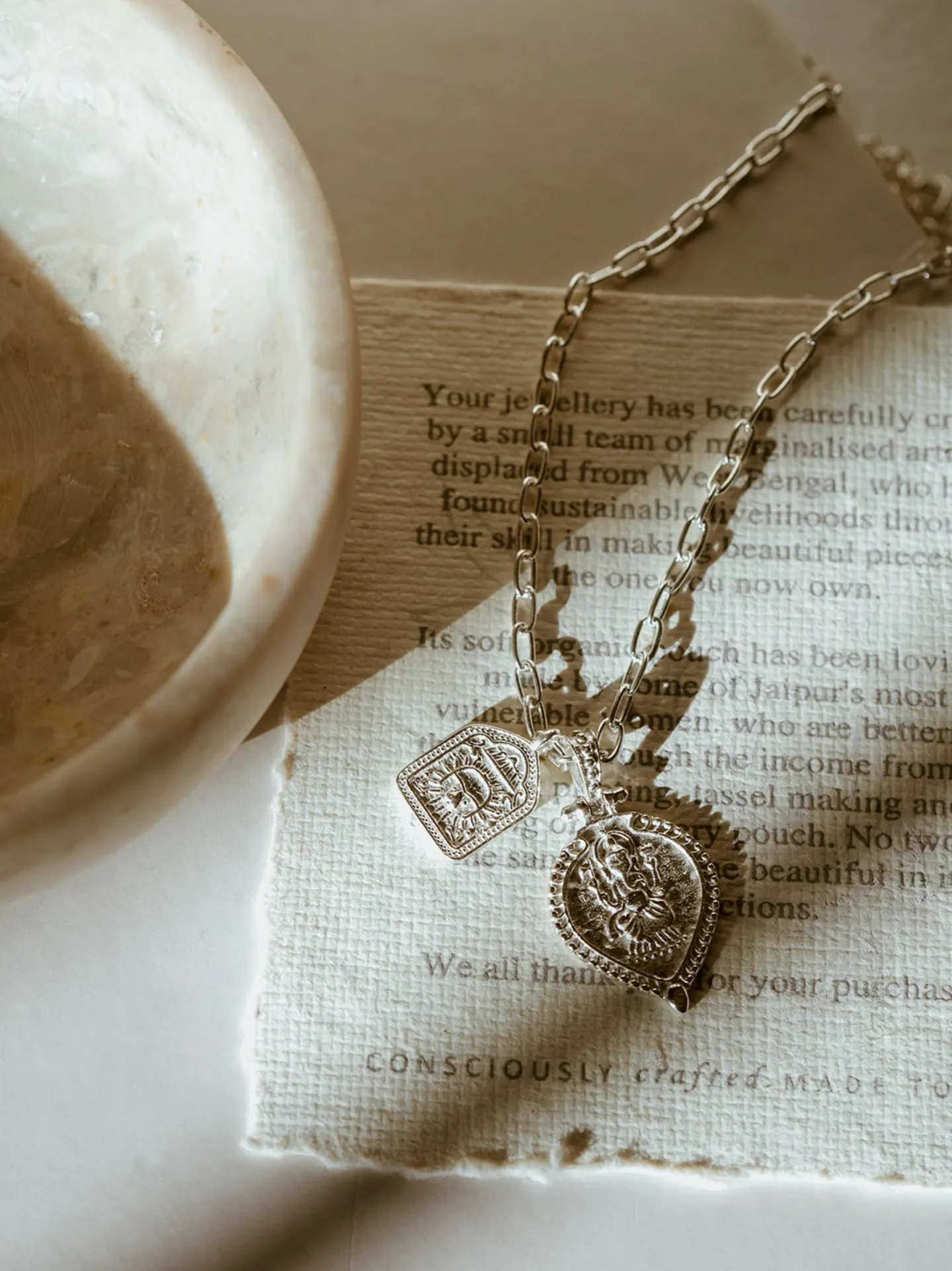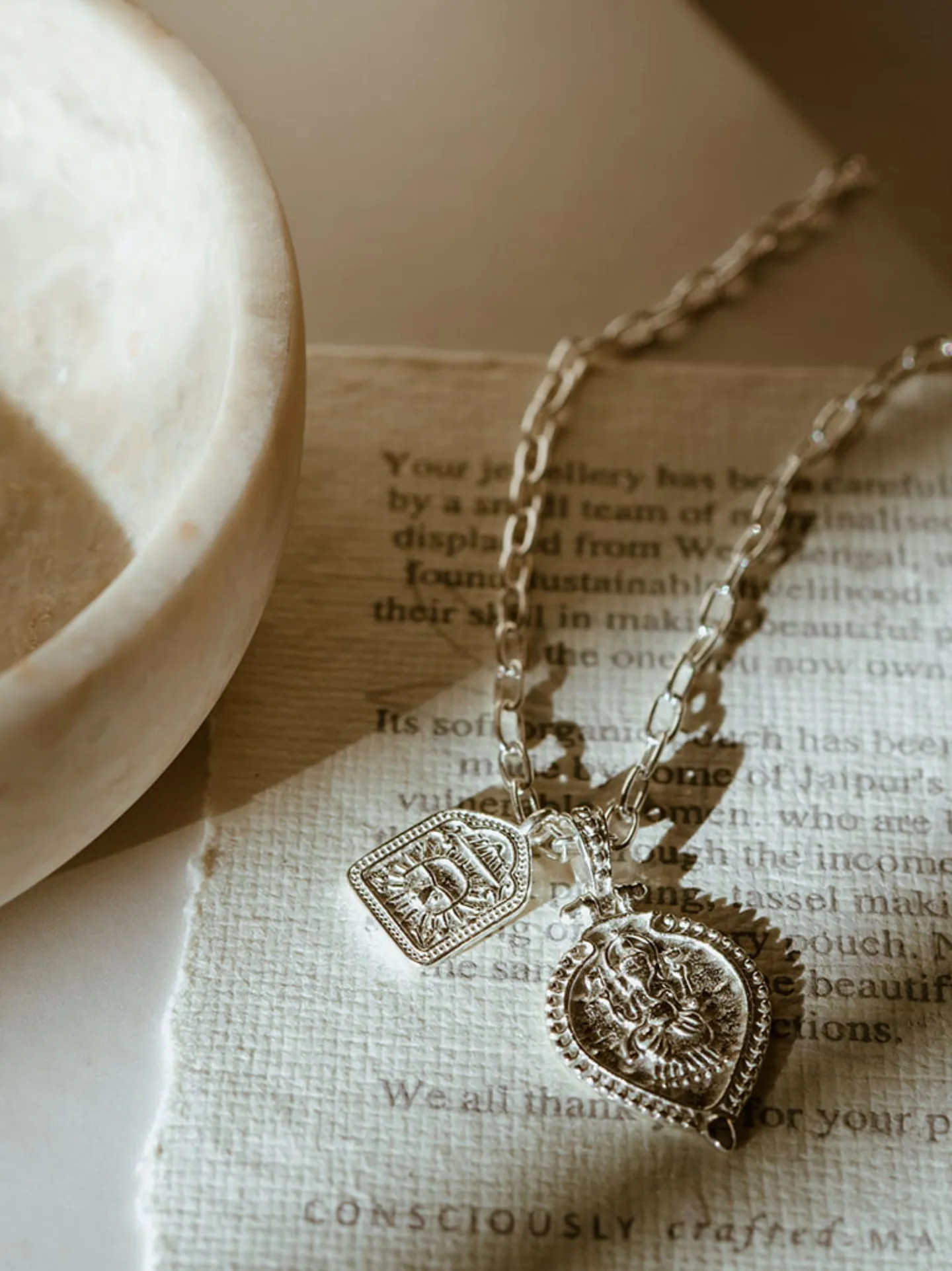 Chain length: 52cm (with adjustment from 46cmGanesh: 28 x 16mm Amulet: 14 x 10mmWeight: 7.51gMaterial: Recycled sterling silver**Pendants are recycled sterling silver, chain & clasp are not recycled.SOCIAL IMPACTThe Magic of New Beginnings has been carefully crafted by a small team of marginalised artisans displaced from West Bengal, who have found sustainable livelihoods through their skill in making beautiful pieces like these.They are proudly certified by the World Fair Trade Organisation.Each piece comes packaged in a soft organic pouch, which has been lovingly made by some of Jaipur’s most vulnerable women, who are bettering their lives through the income from the block printing, tassel making and stitching of these very pouches. No two are the same, each one beautiful in its imperfections.PLANET FRIENDLY PACKAGINGPackaging is mindfully thought through to be kind to the planet.In addition to our organic cotton jewellery pouches, your jewellery will come pacakged with tree-free recycled cotton paper care tags, soy based, compostable tissue paper and a recyclable eco postal box made from certified sustainable sources. Even our embossed stickers are wood-free and completely biodegradable.To help keep your jewellery looking lovely, each piece comes with a soft branded jewellery cloth.