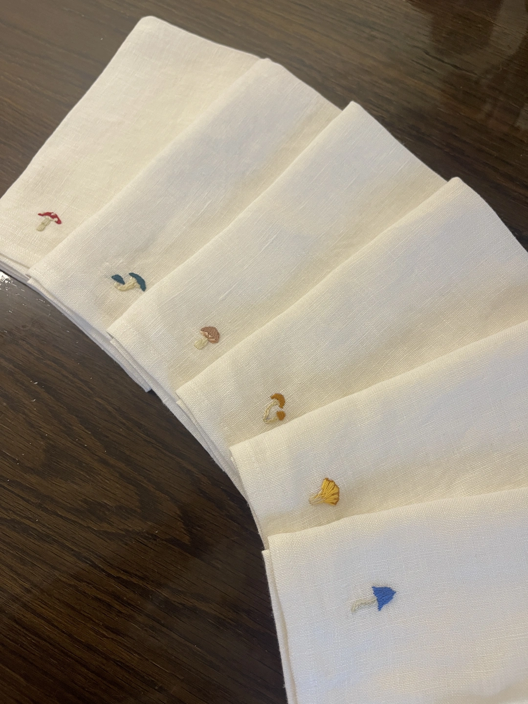 100% stonewashed linen napkins, 40cm x 40cm, hand-embroidered with mushroom motifs.