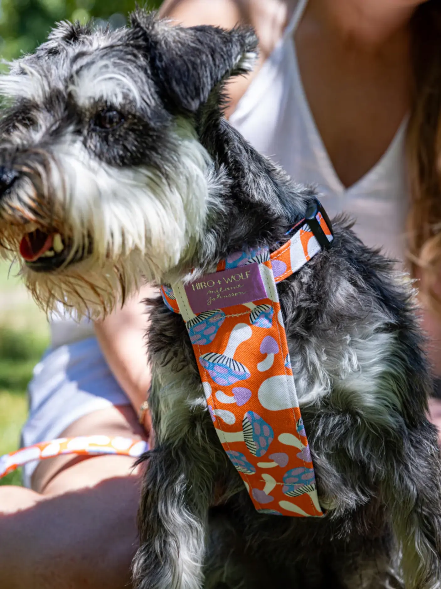 ABOUT THE PRINT: Designed by local illustrator Mélanie Johnsson, this enchanting print features a bold orange background, adorned with whimsical mushrooms. Inspired by the magic of the outdoors, this print is sure to delight human and hound alike. Perfect for every fun-guy out there!